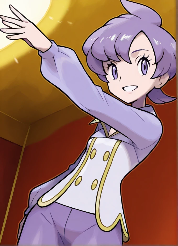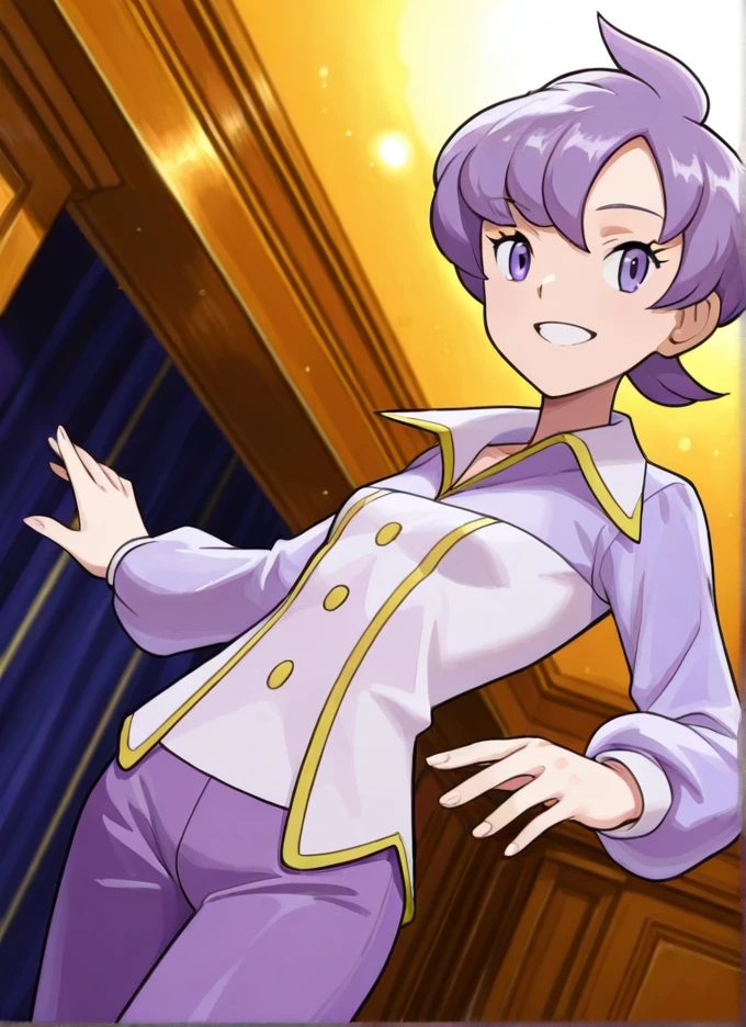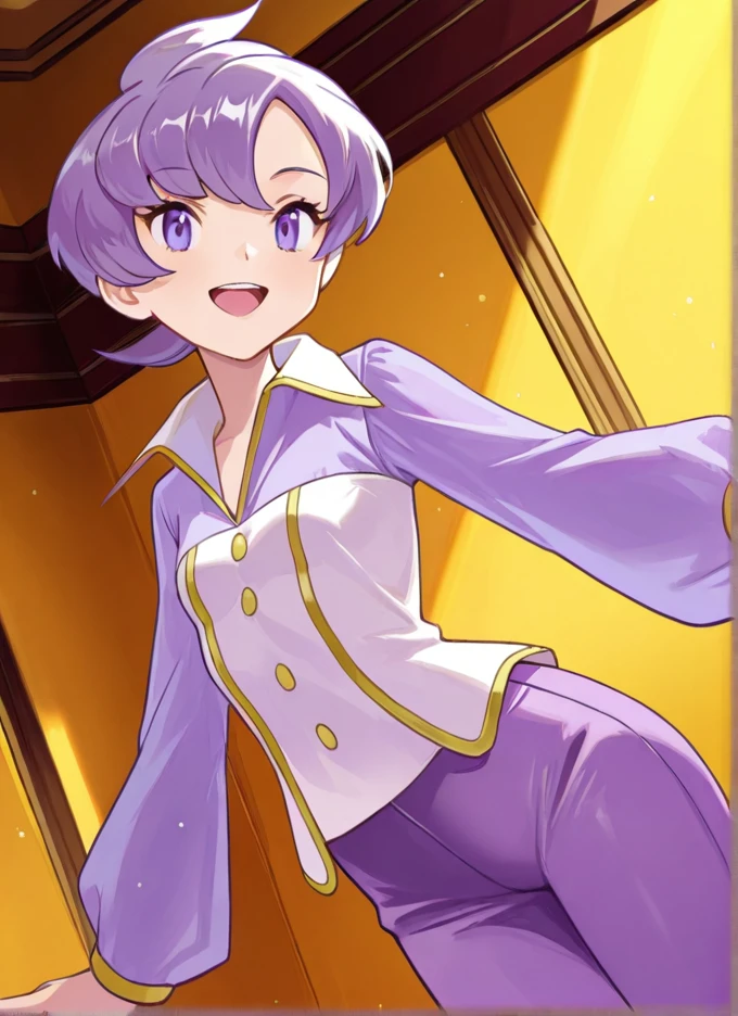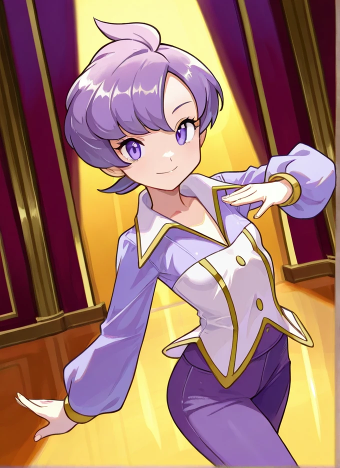 Young: anabel, 1girl, solo, short hair, purple hair, purple eyes, purple shirt, long sleeves, purple pants, buttons, tiny ???????,