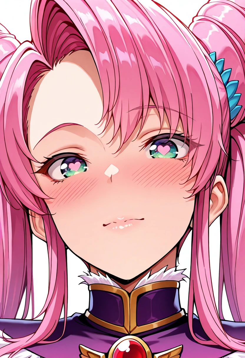 aphrodite, red eyes, pink hair,gloves, cone hair bun, long hair, twintails, elbow gloves, hair bun, ???? shoulders, double bun, pink gloves,