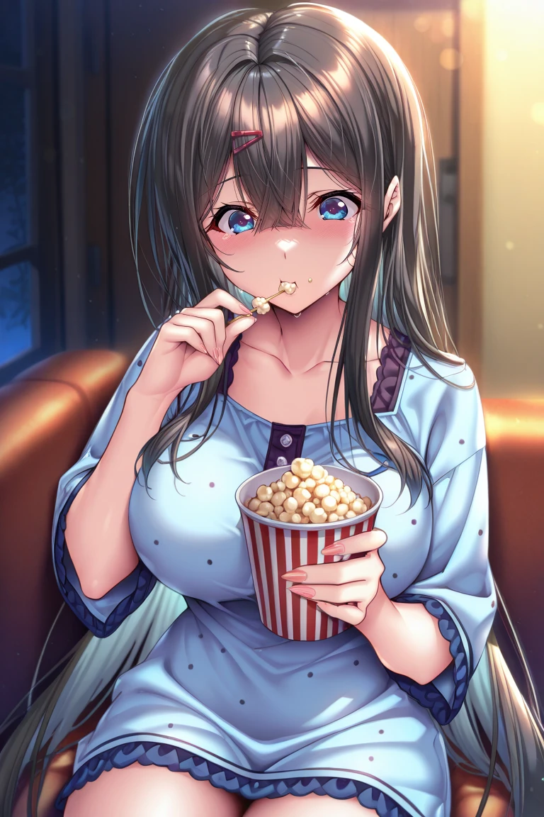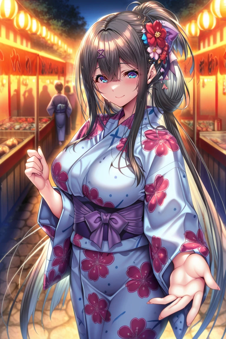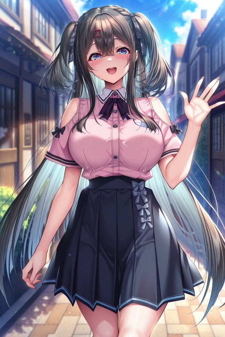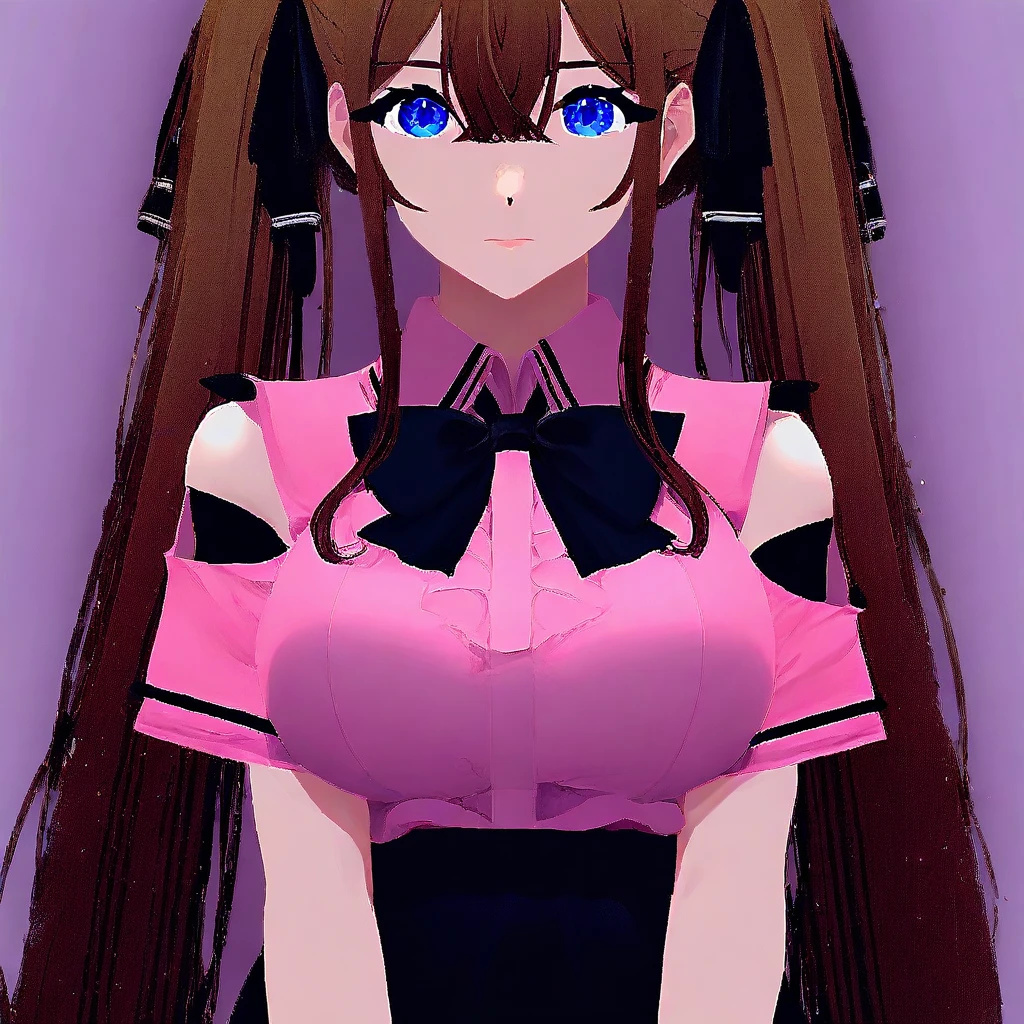 very long hair, brown hair, sidelocks, bangs, hair between eyes, hair ribbons, blue eyes, large breasts,