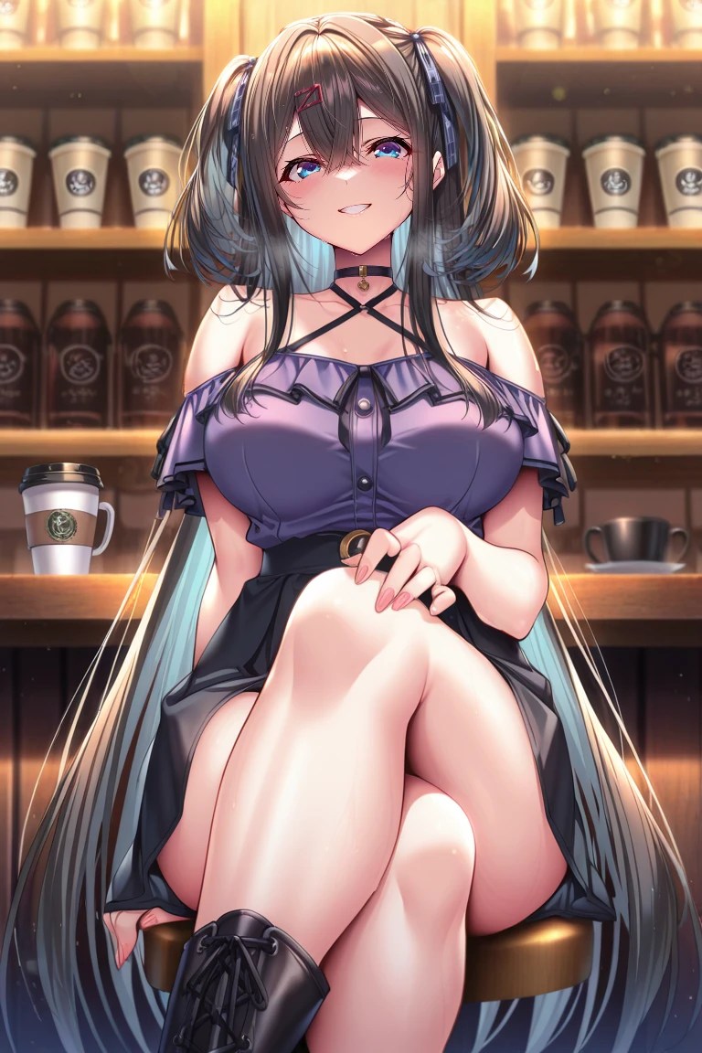 sayumi-atlernate, purple shirt, off-shoulder, bare shoulders, choker, halterneck, criss-cross halter, black skirt, black boots,