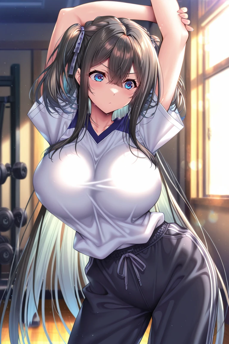 sayumi-gym, white shirt, short sleeves, black sweatpants,