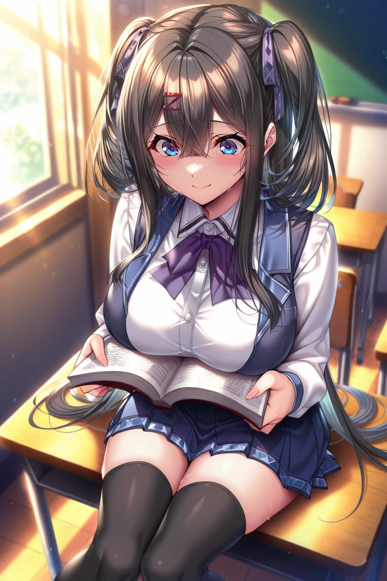 sayumi-uniform, white shirt, purple ribbon, vest, blue skirt, pleated skirt, black thighhighs, zettai ryouiki, brown shoes,