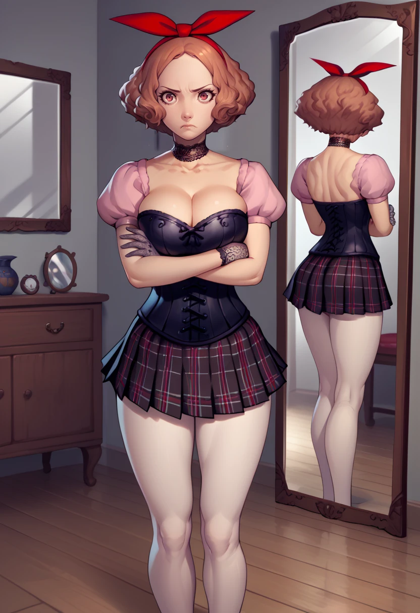 Starlight Outfit (P5D): dncHaru, short hair, hair bow, red ribbon, puffy short sleeves, corset, cleavage, lace choker, print gloves, plaid skirt, pleated skirt, white pantyhose, ballet slippers, cross-laced footwear, leg ribbon