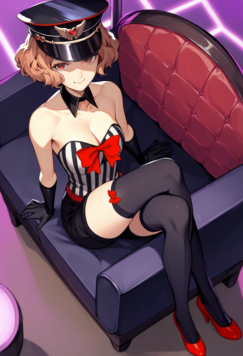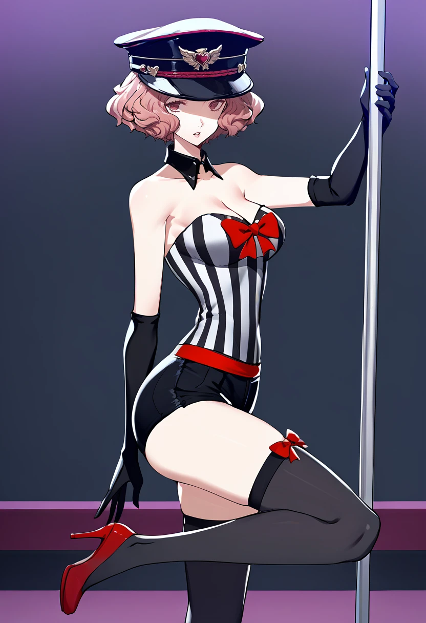 Last Surprise (P5D): lsHaru, short hair, peaked cap, detached collar, bare shoulders, strapless, striped bodice, red bow, black elbow gloves, black short shorts, black thighhighs, bow legwear, red high heels