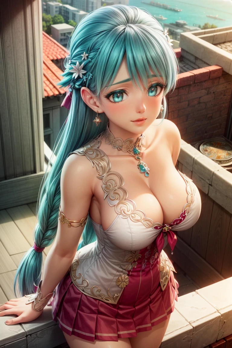 Useful Trags: long hair, breasts, aqua eyes, hair ornament, flower, dress, bow, jewelry, aqua hair, braid, earrings, sleeveless, bracelet, single-shoulder dress, bare shoulders