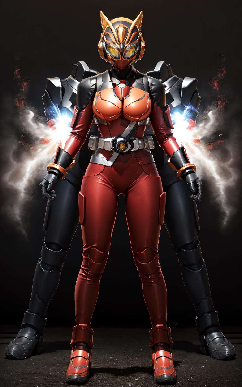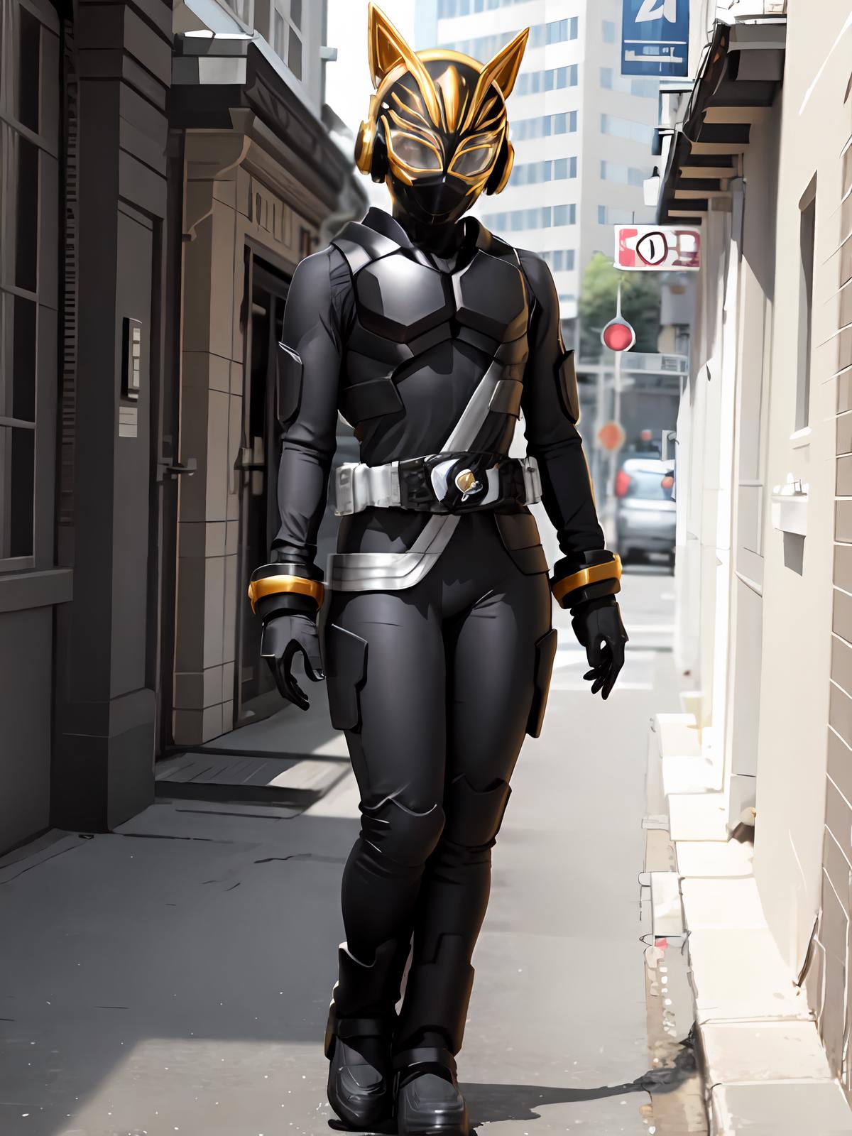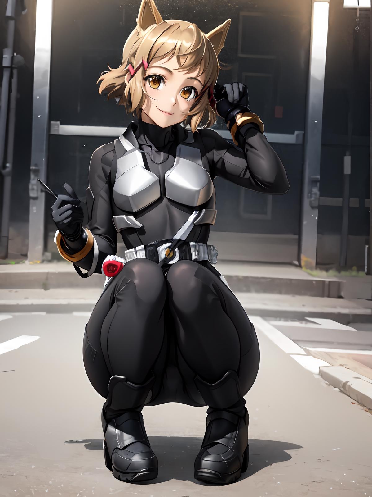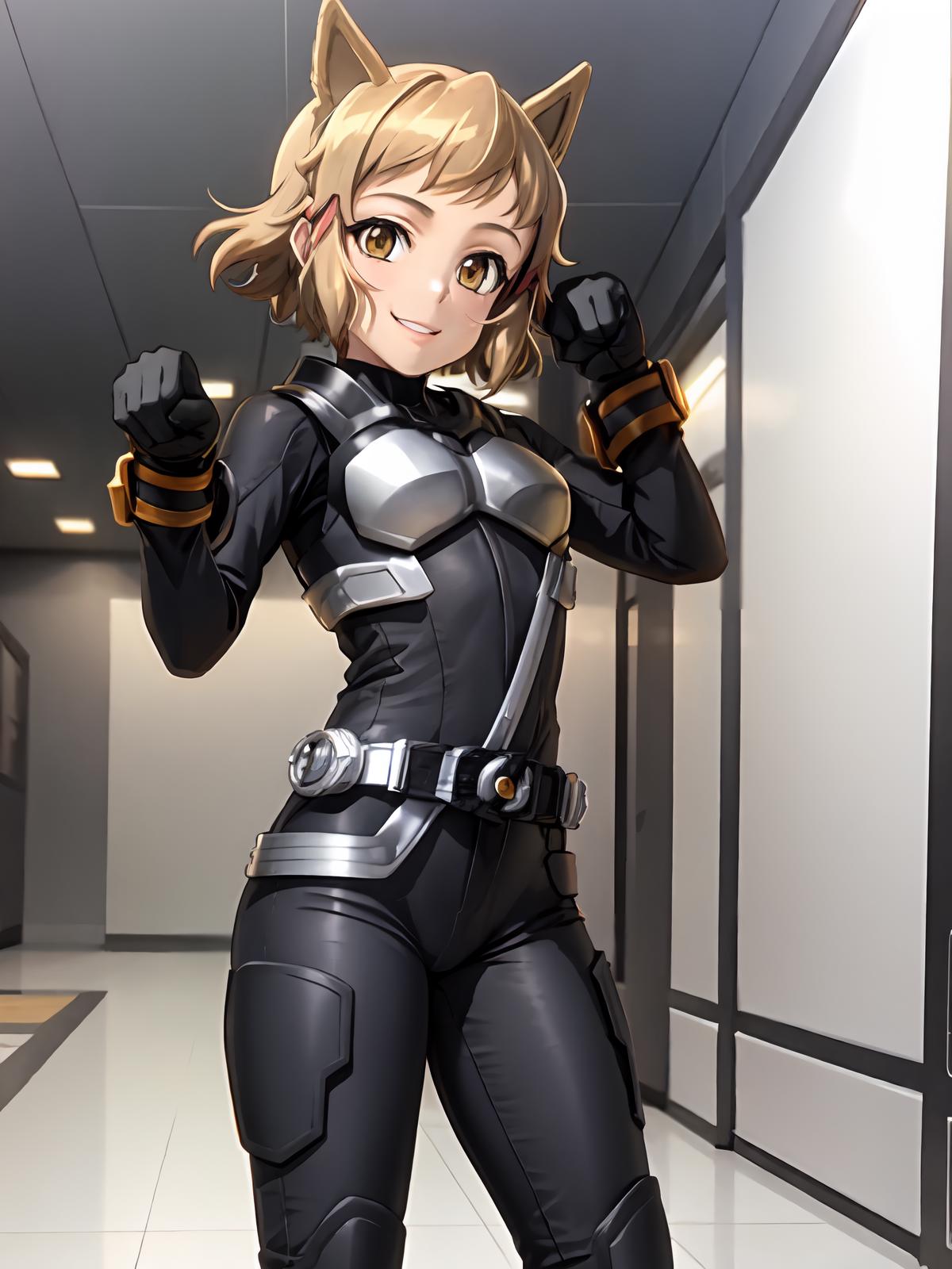 Prompts: gloves,rider belt, belt,bodysuit,helmet,cat ears, armor,mask,black gloves,handcuffs,black footwear,boots,fake animal ears,