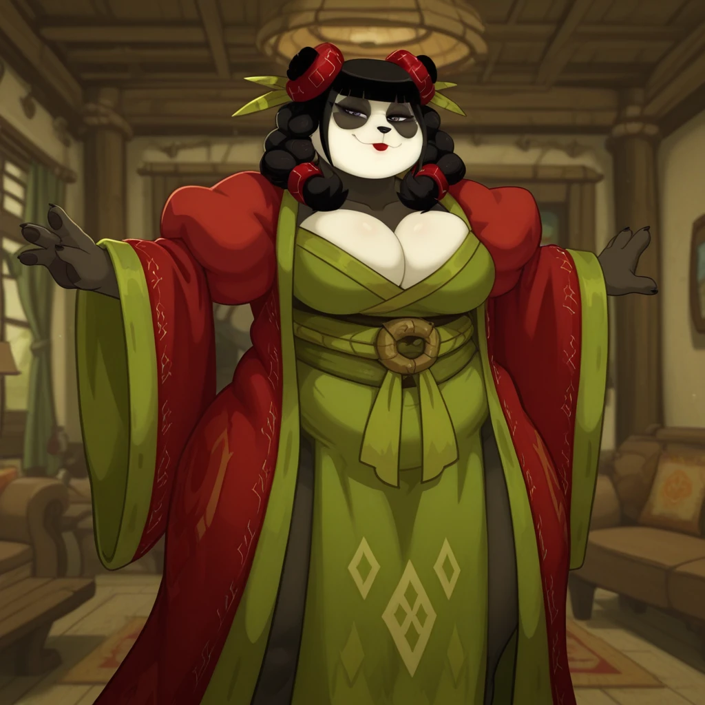 d4ih1tsu, solo, female, anthro, giant panda, two tone body, mature female, grey eyes, black hair, hair on shoulders, blunt bangs, long hair, long bangs, braided pigtails, long pigtails, red lipstick, black nose, animal ears, red hair tie, red hair accessory, big breasts, slightly chubby, finger claws, 4 fingers, wide hips, nub tail, white breasts