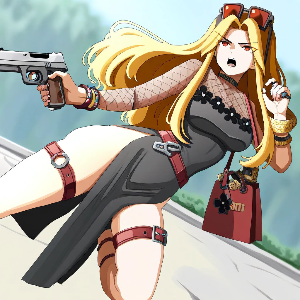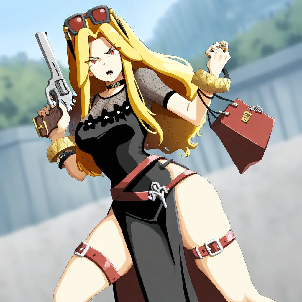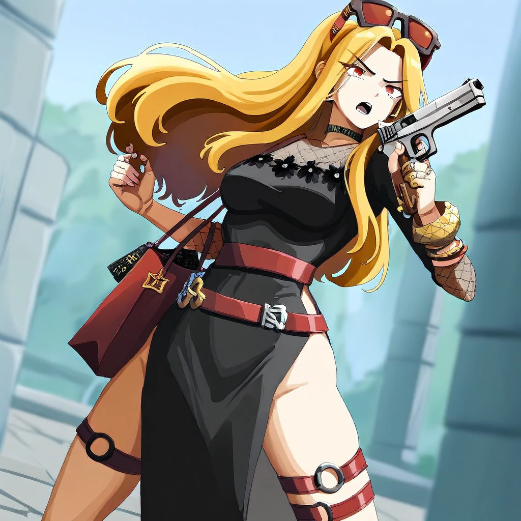 BlackTeaJenny_IL, black long-dress, side-slit, black flowers, black choker, fishnet top, red belt, leg belts, tote bags, dark-red sunglasses, sunglasses on head, bracelets, jewelry, red handbag,