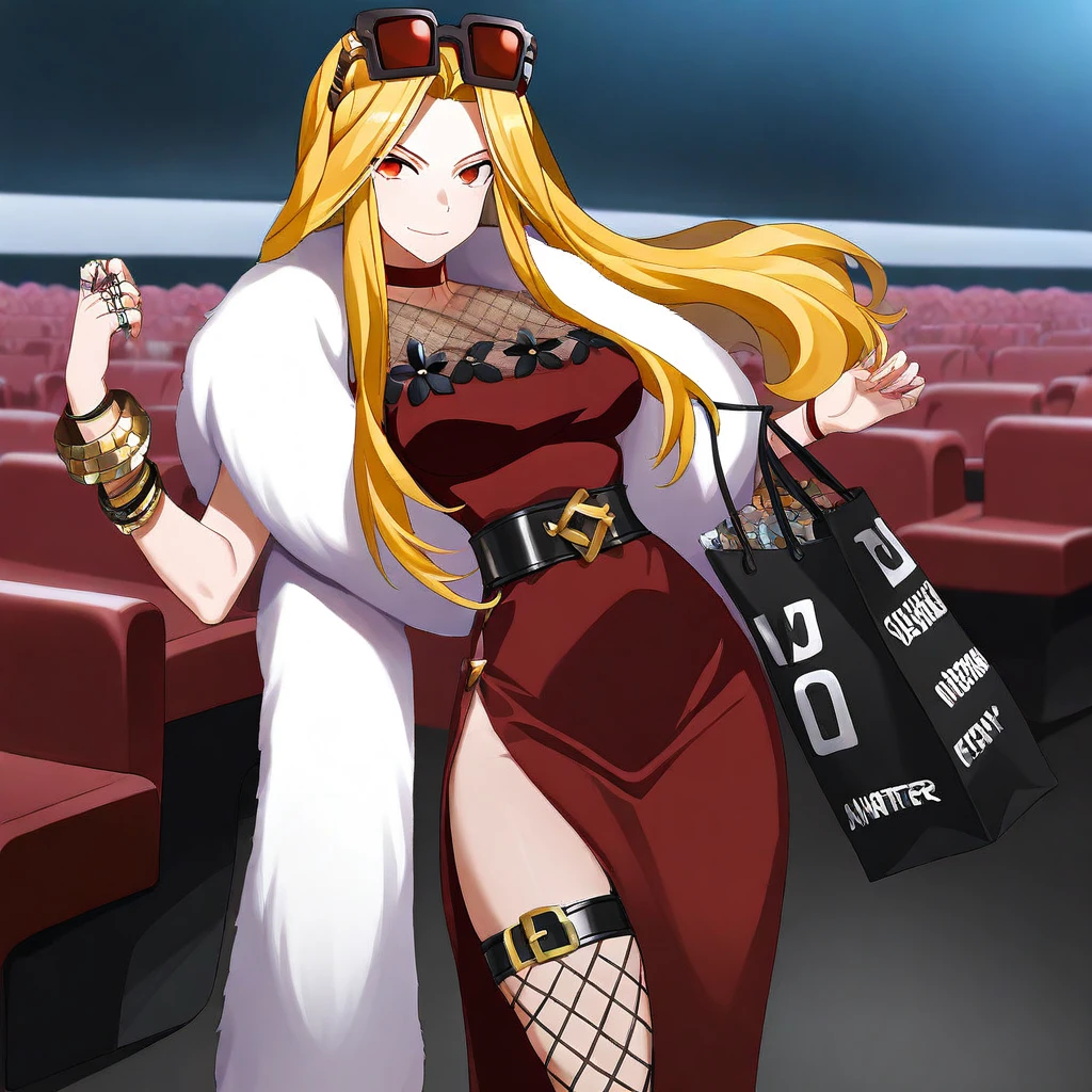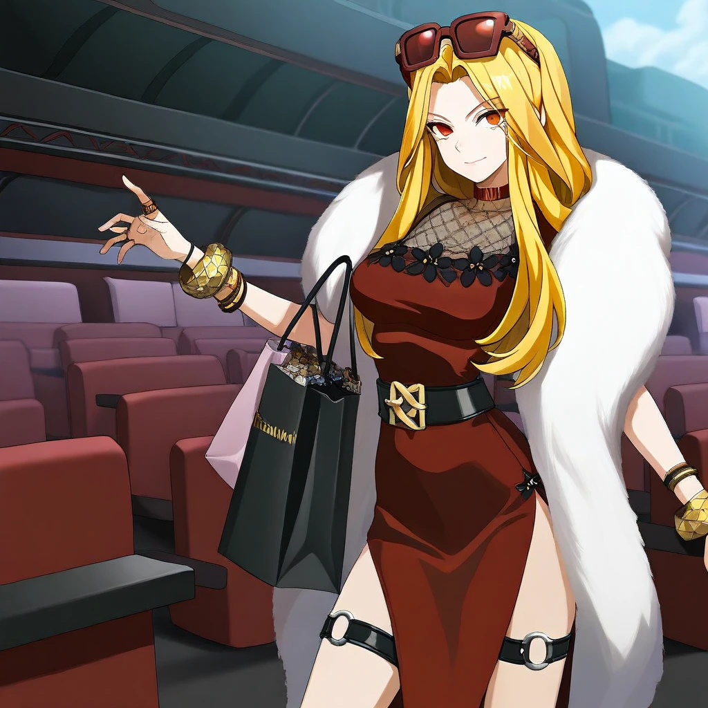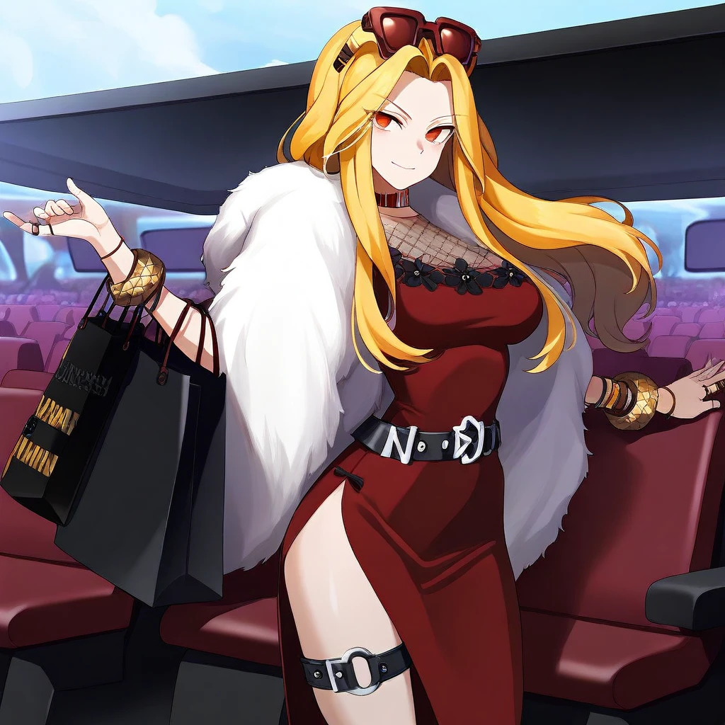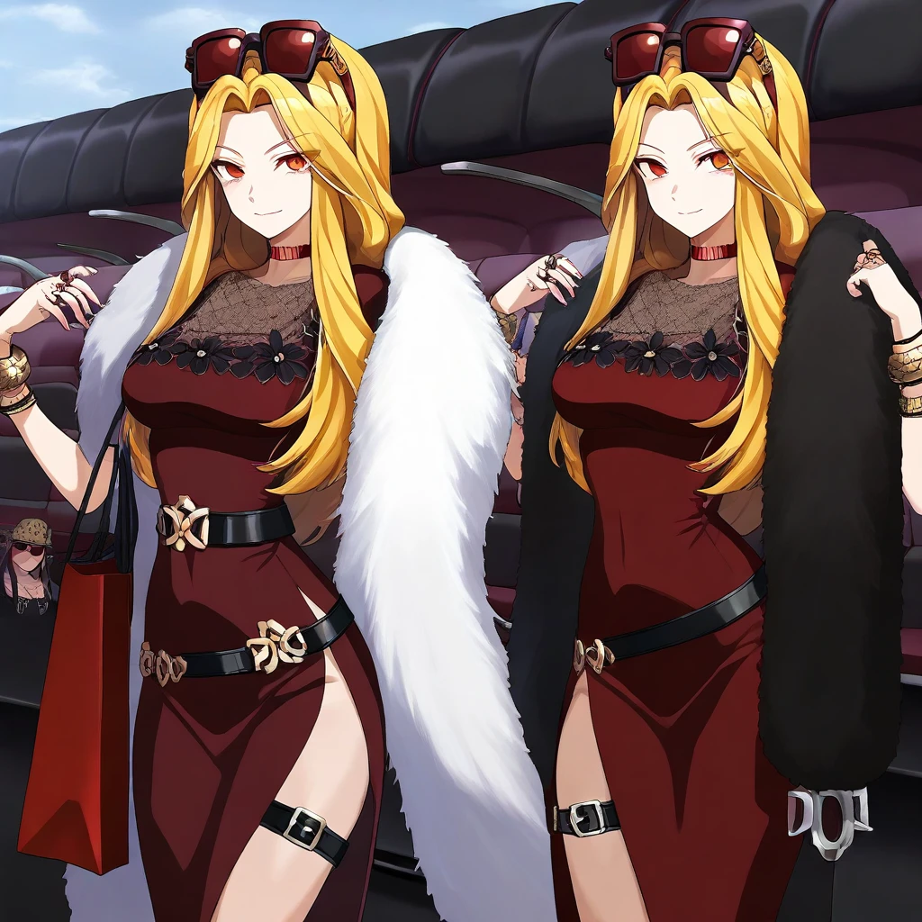 RedWineJenny_IL, red long-dress, side-slit, black flowers, red choker, fishnet top, off-white fur scarf, black belt, leg belts, black high-heels, tote bags, dark-red sunglasses, sunglasses on head, bracelets, jewelry, tote bags,