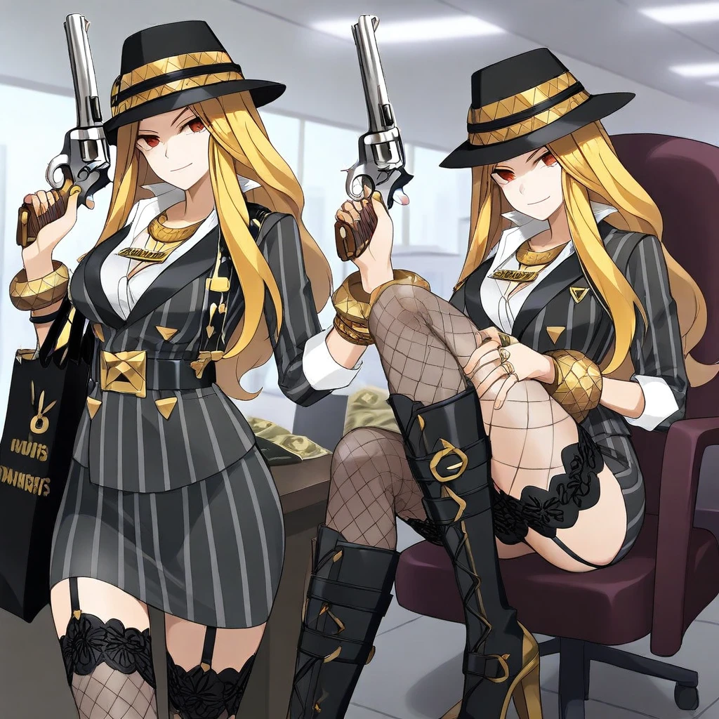 MobsterJenny_IL, dark-gray striped suit, white collared shirt, gold buttons, black belt, gold belt buckle, dark-gray striped skirt, fishnet thighhighs, garter straps, black knee-boots, high-heels, dark-gray fedora hat, gold jewelry, gold necklaces, gold bracelets, gold rings,