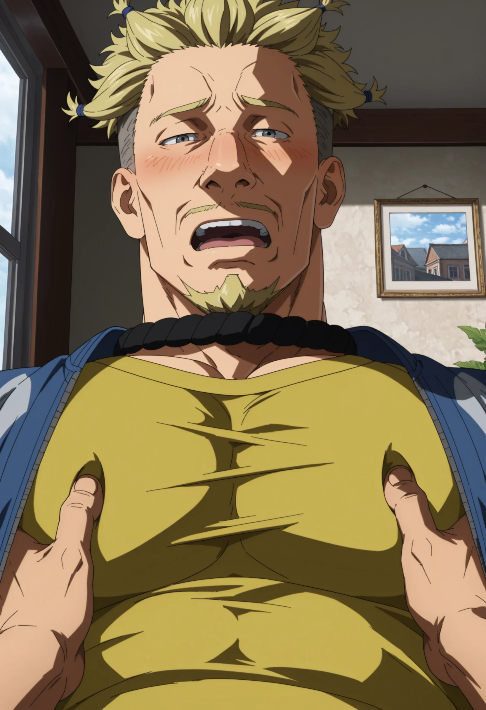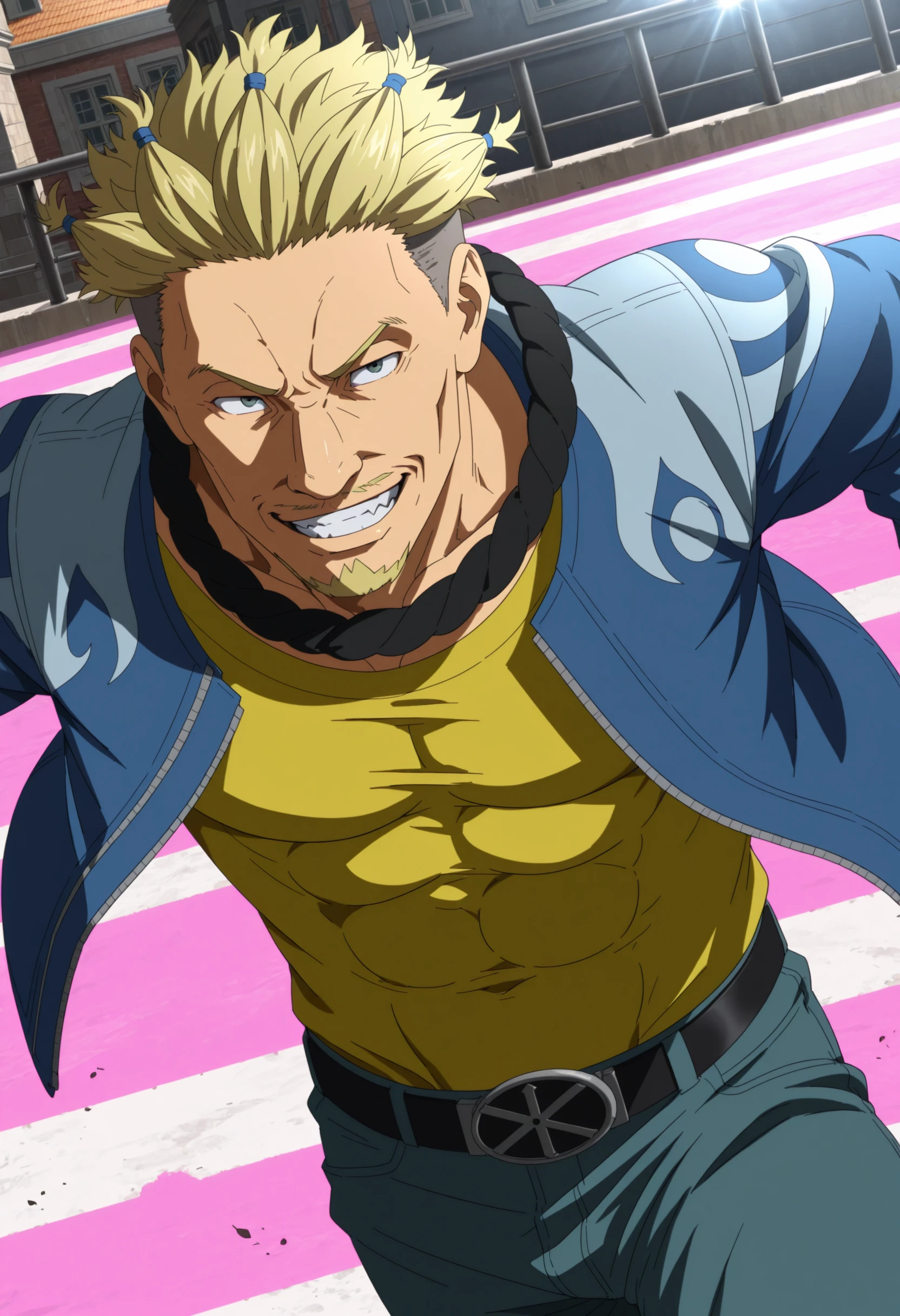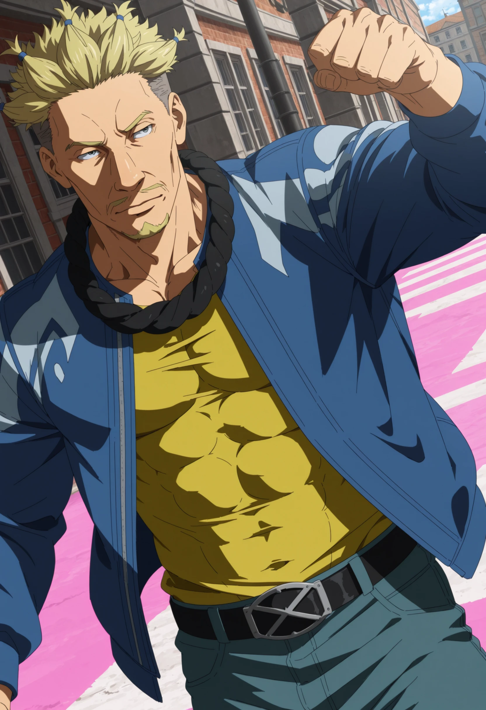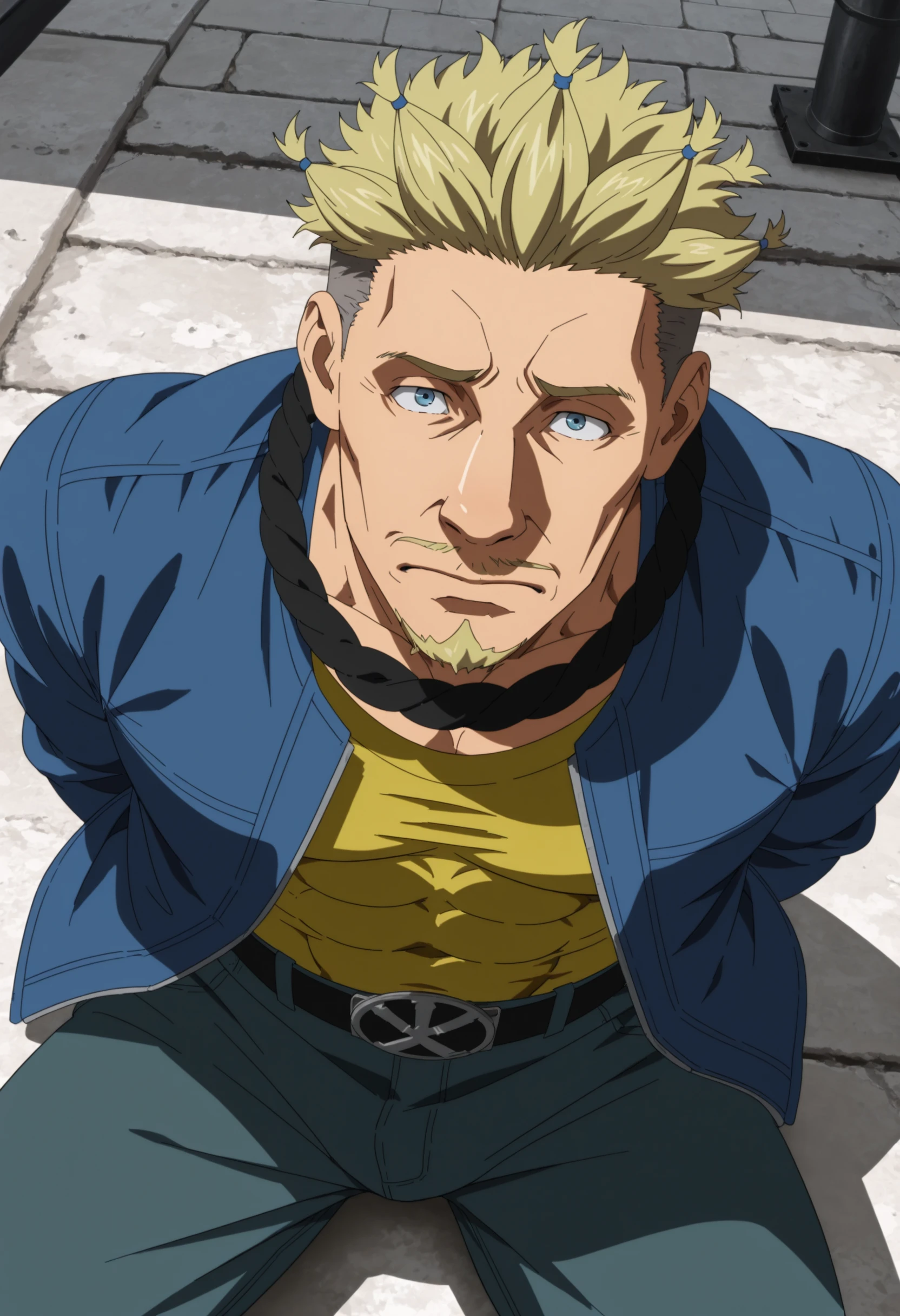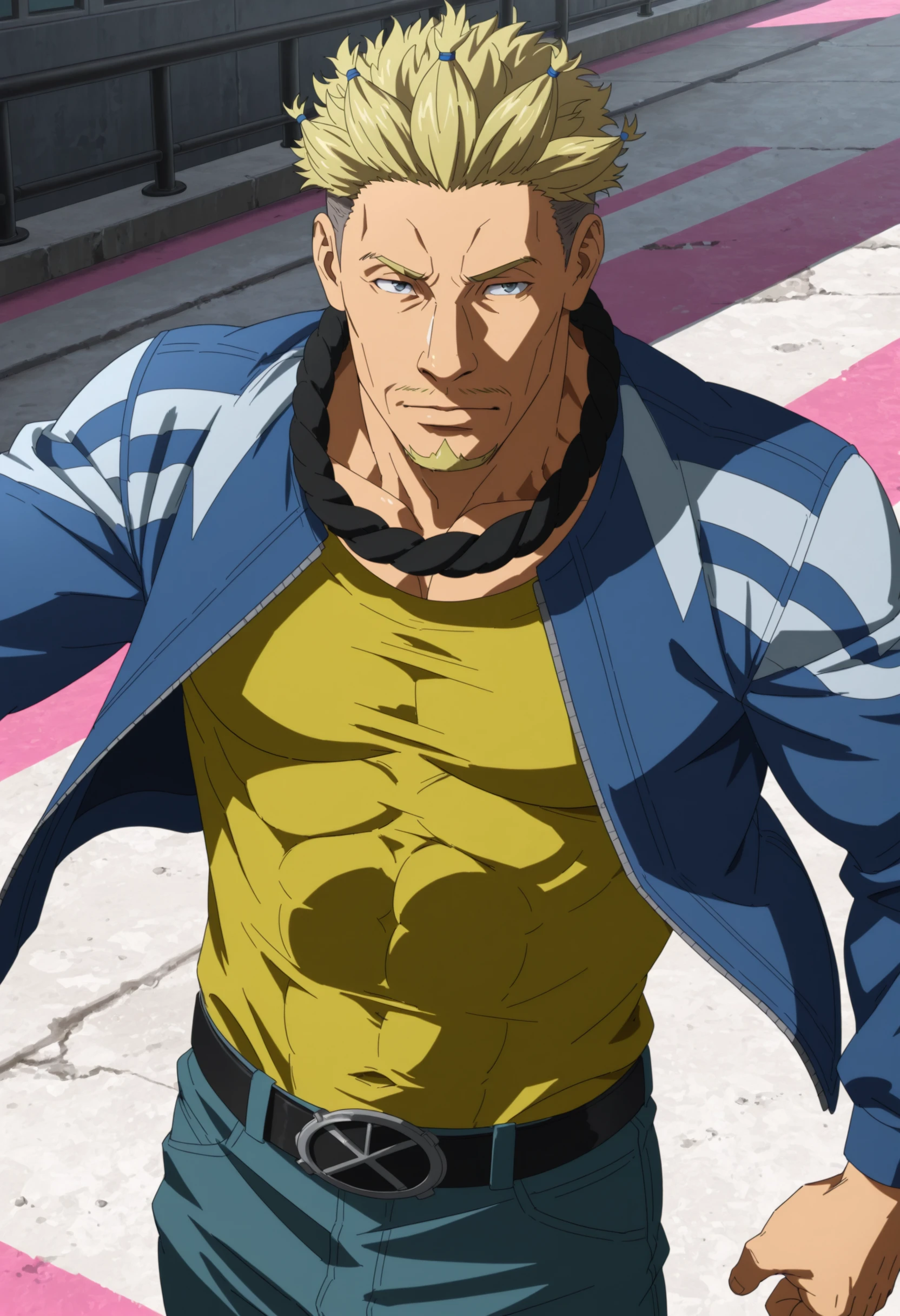 blonde spiky hair with blue hair ties, under cut hair, blue jacket with white stripes, taut yellow shirt, aqua color jeans, black belt, goatee, moustache, black band on neck