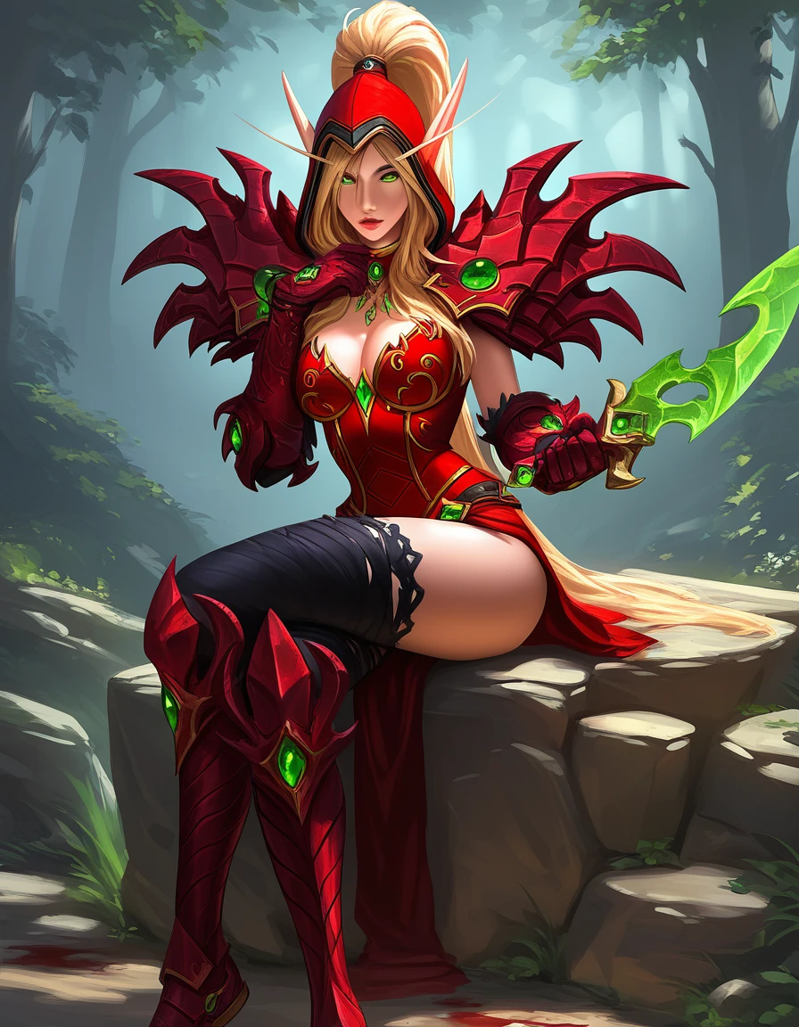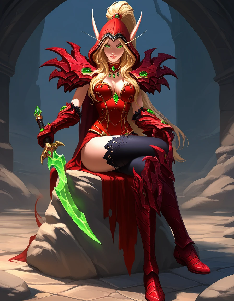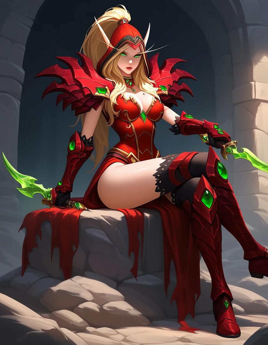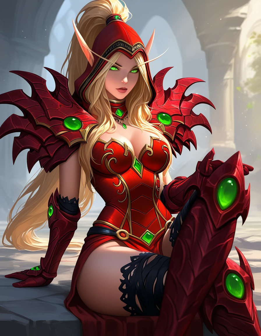 Valeera Sanguinar, 1girl, solo, elf, blood elf, blonde hair, long hair, ponytail, long pointy ears, green eyes, long eyebrows, lips