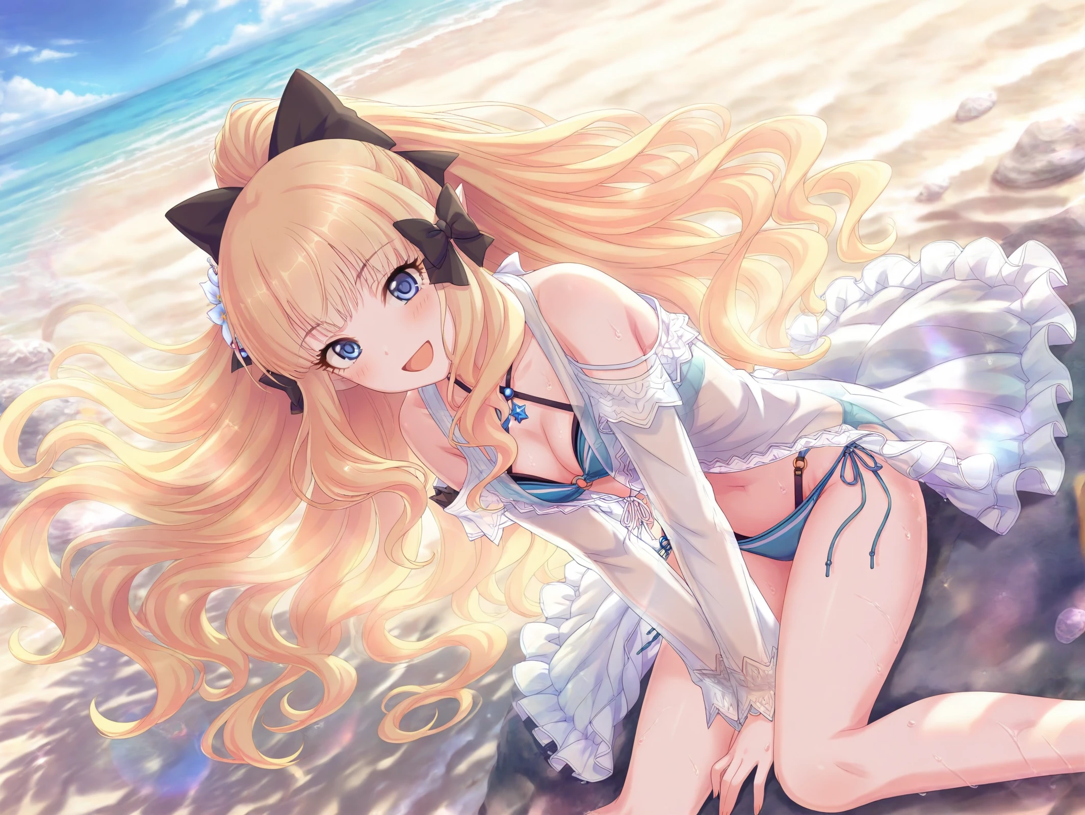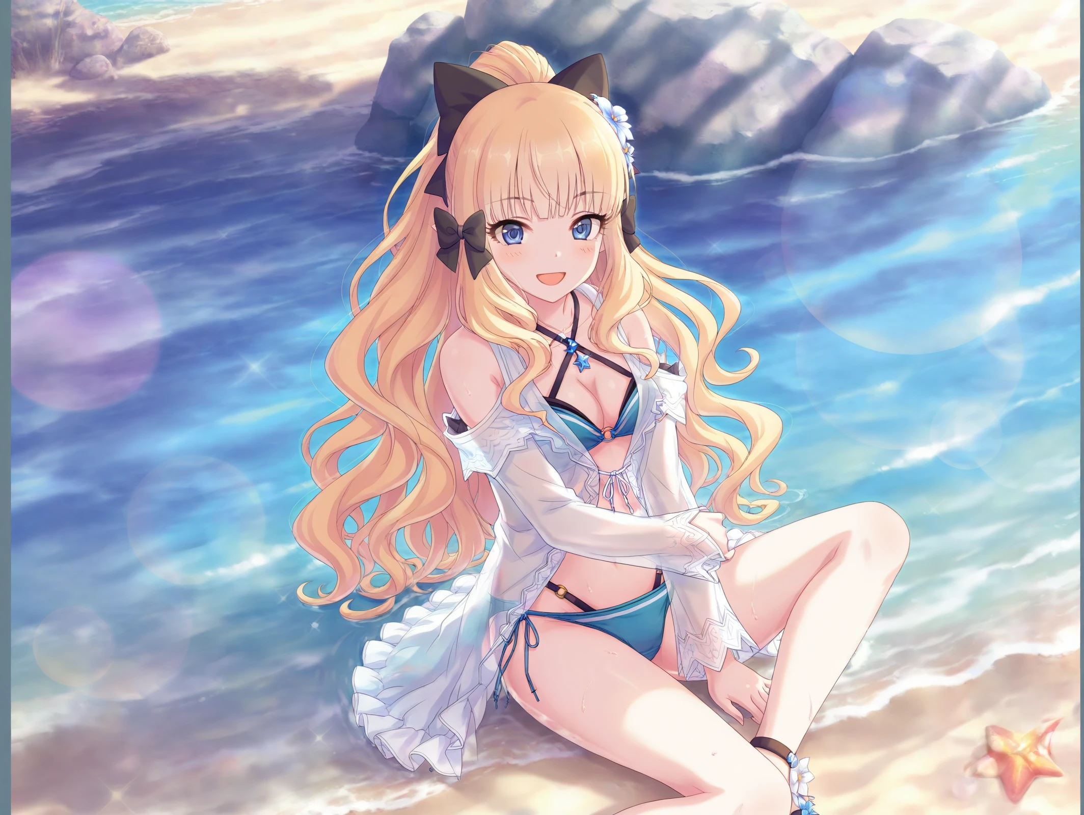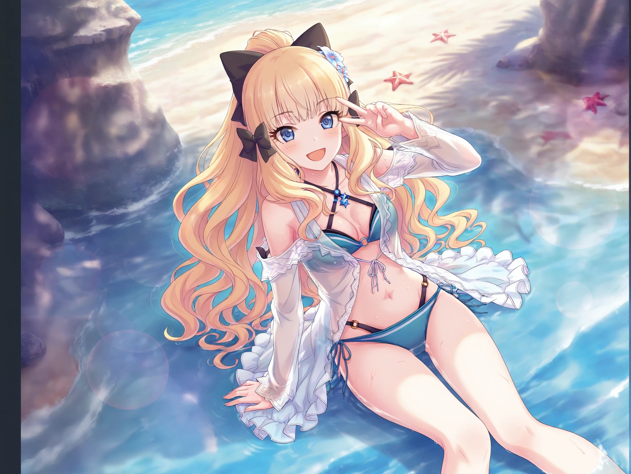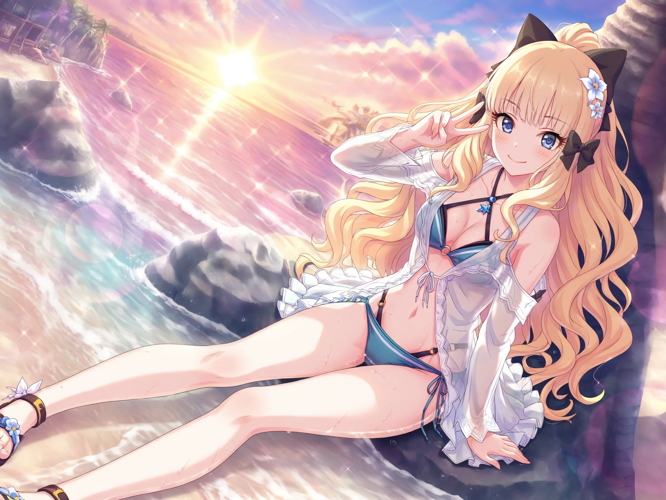 absurdres,official style,<lora:Saren54??:1>,1girl,saren \(summer\) \(princess connect!\),hair flower,blonde hair,swimsuit,hair up,hair bow,flower,layered bikini,blue eyes,hair ornament,ponytail,side-tie bikini bottom,sandals,o-ring bikini,criss-cross halter,long sleeves,beach,sitting in the sea,one-handed support,wet body,v,