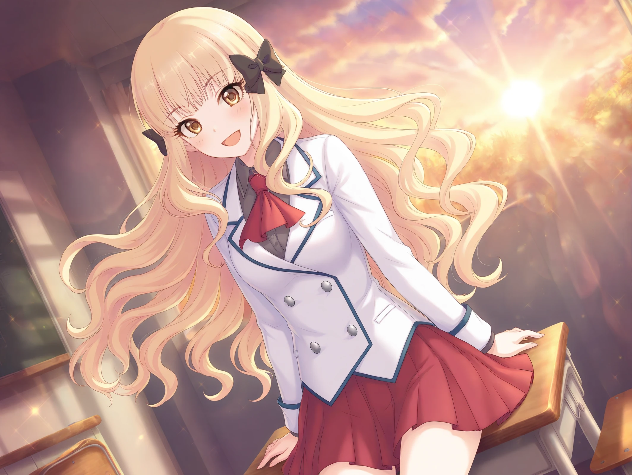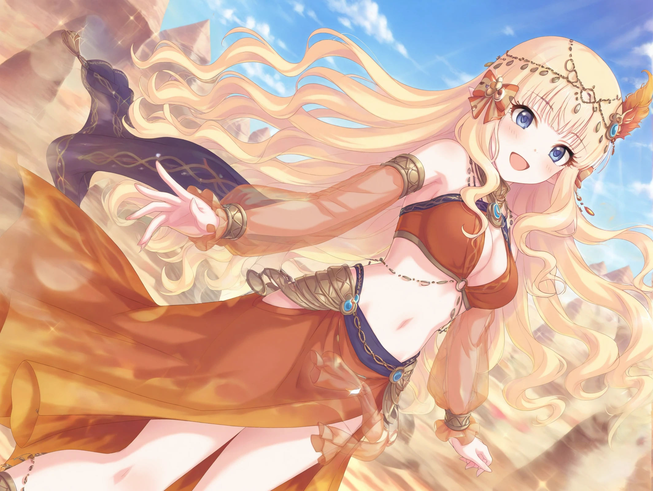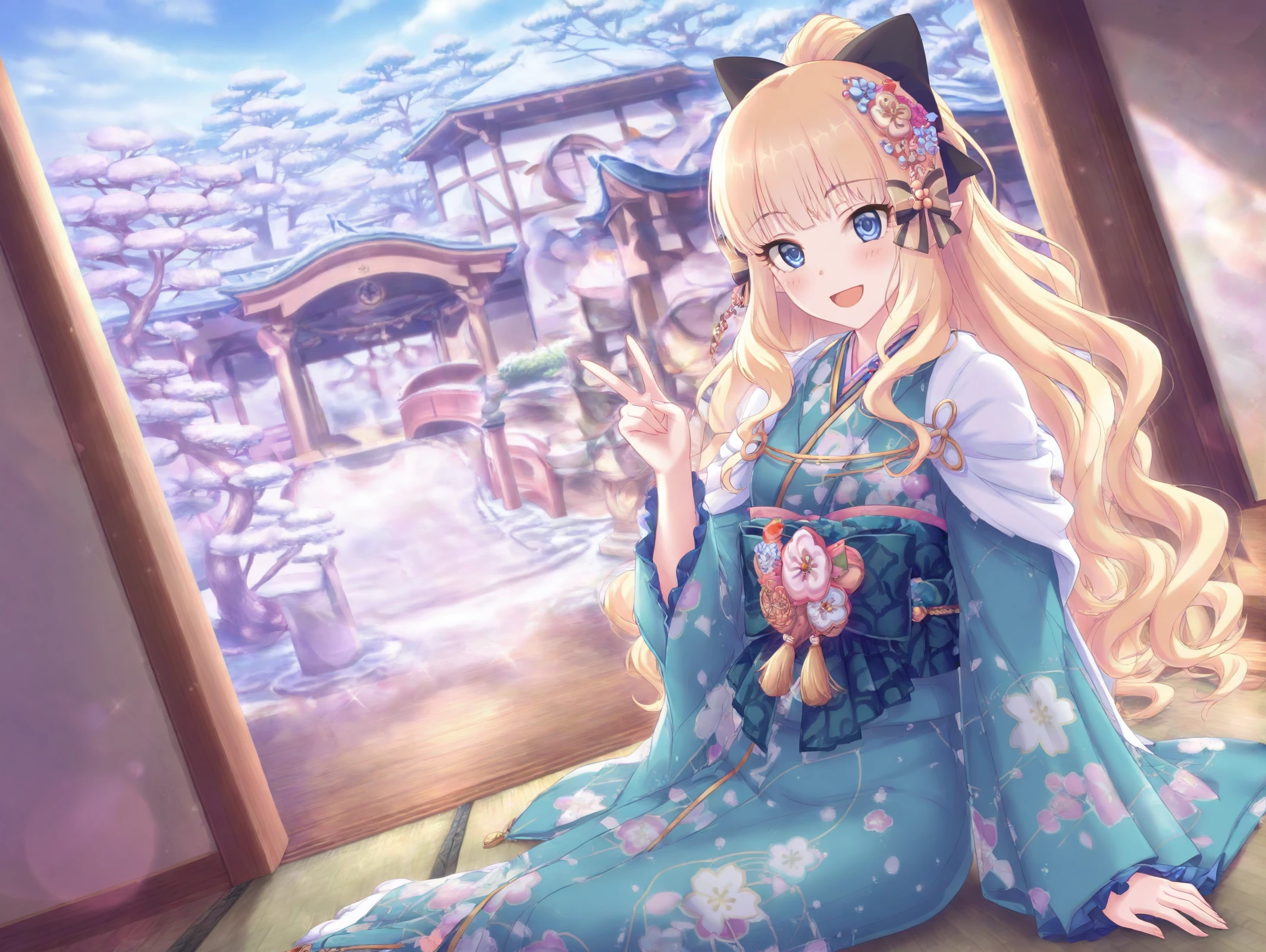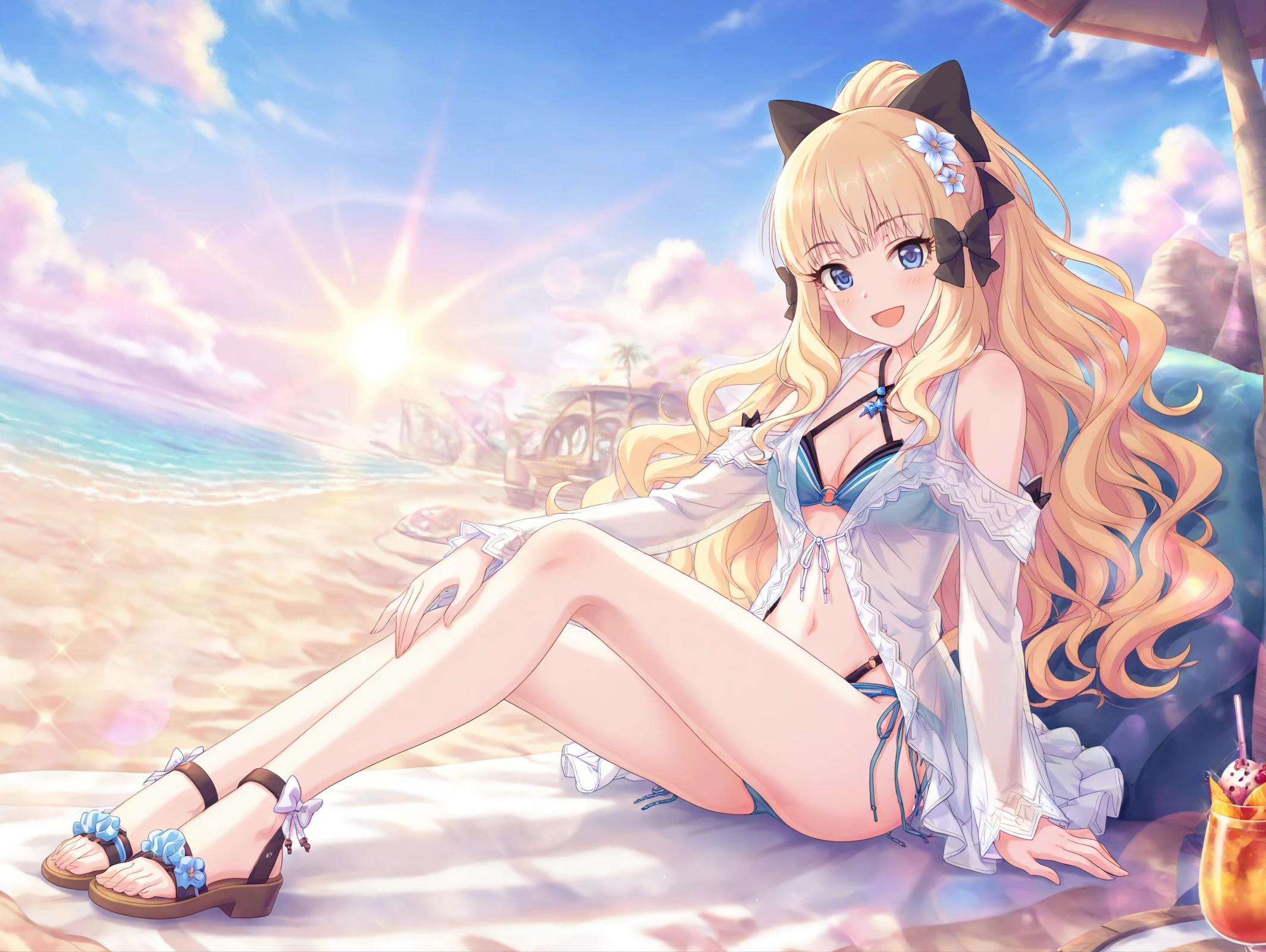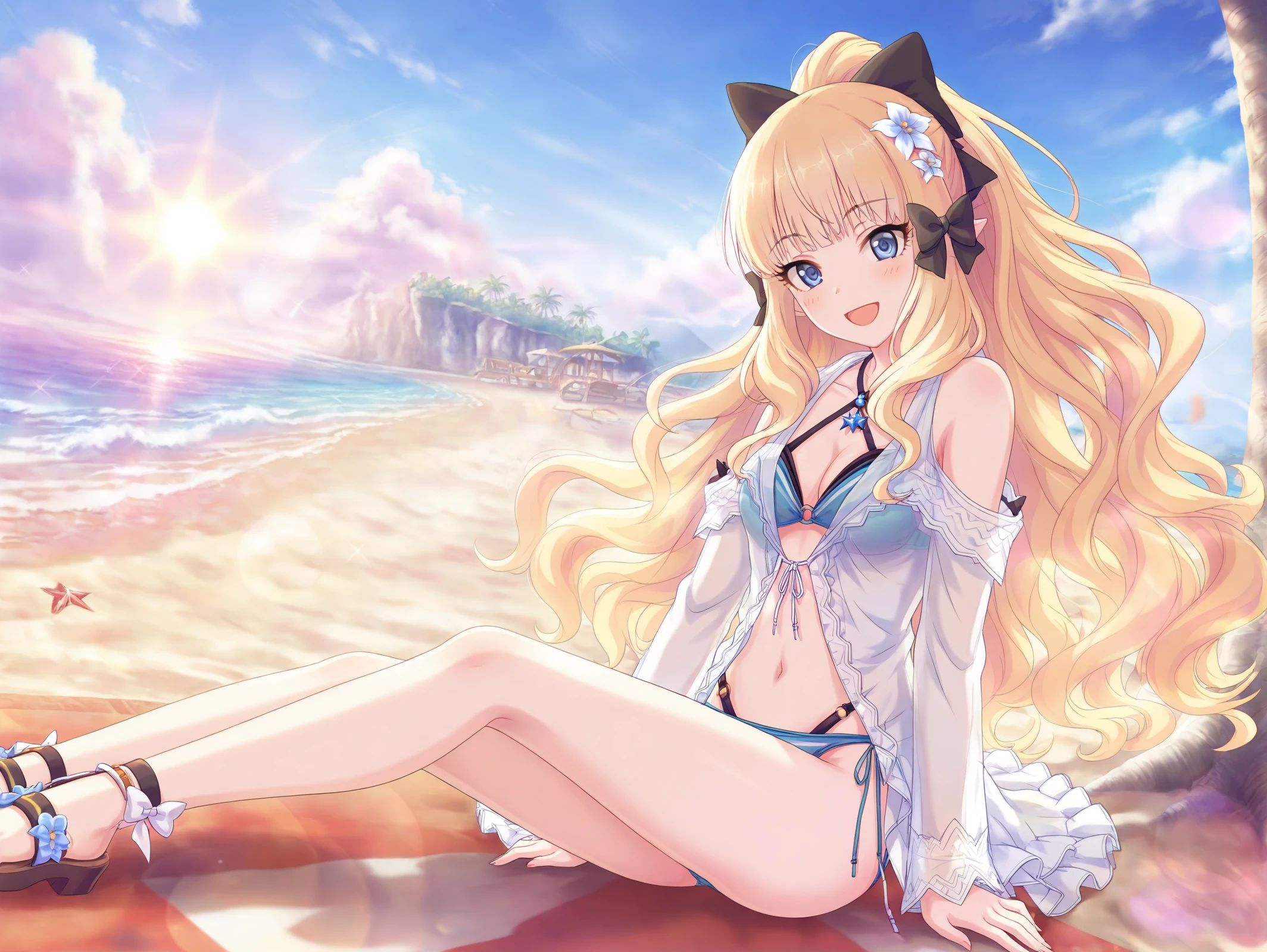 absurdres,official style,<lora:Saren54??:1>,1girl,saren \(summer\) \(princess connect!\),hair flower,blonde hair,swimsuit,hair up,hair bow,flower,layered bikini,blue eyes,hair ornament,ponytail,side-tie bikini bottom,sandals,o-ring bikini,criss-cross halter,long sleeves,beach,sitting in the sea,one-handed support,wet body,v,