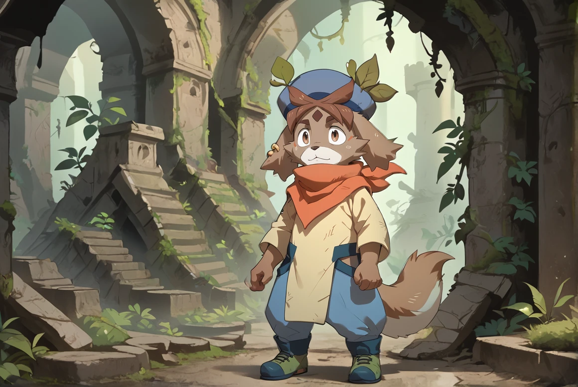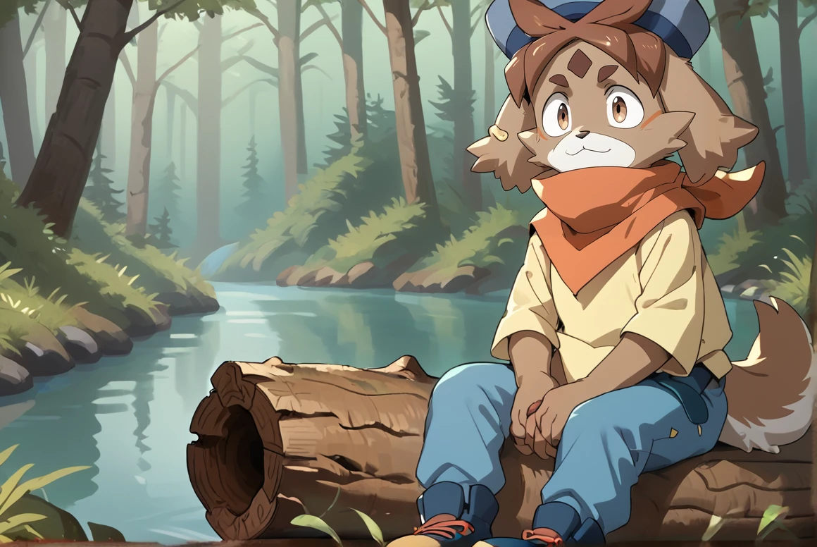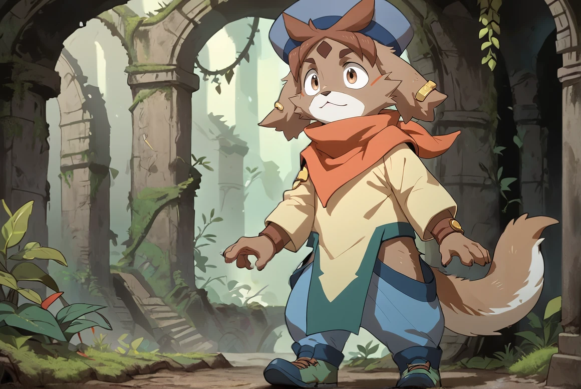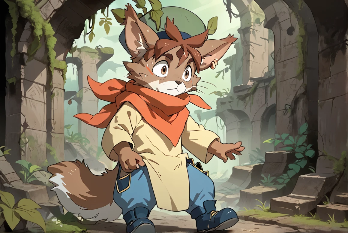 1boy, furry male, fr3ddi3, solo, animal ears, brown eyes, earrings, scarf, tail
