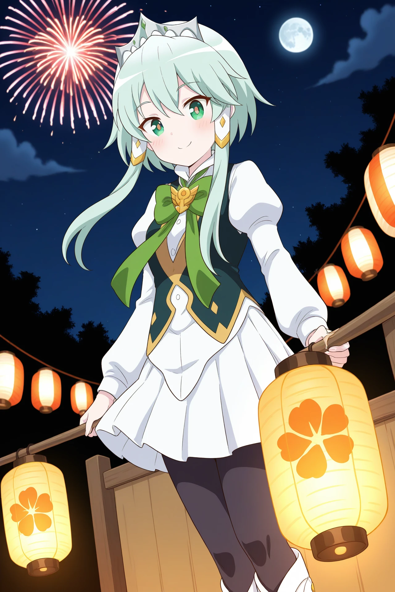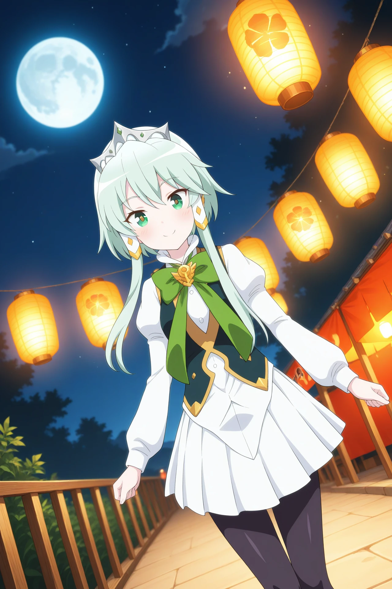 long sleeves, puffy sleeves, green bow, green bowtie, white skirt, pleated skirt, black pantyhose, boots, white footwearDescription