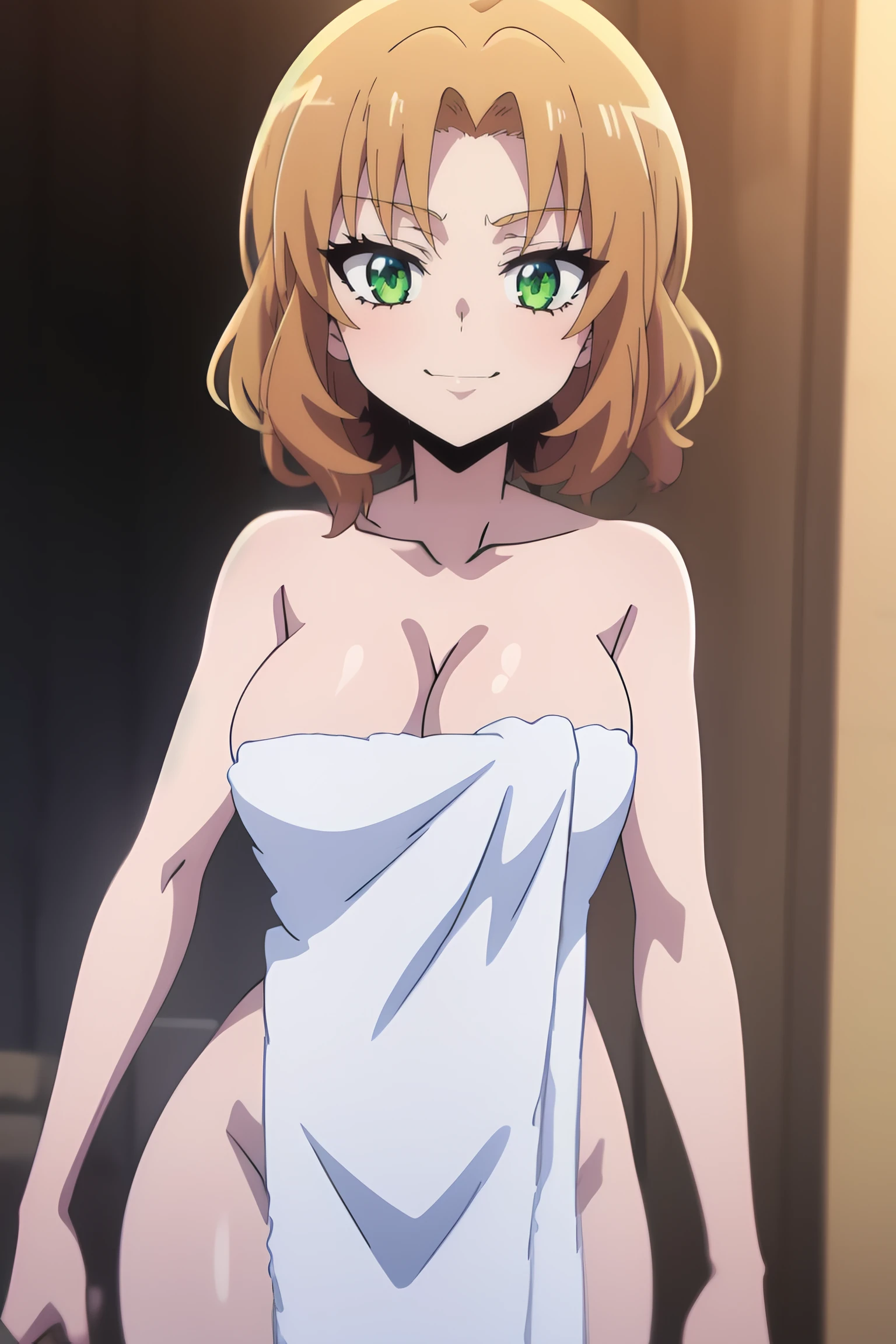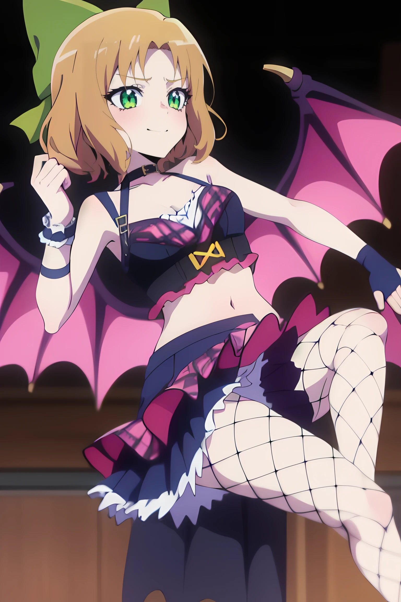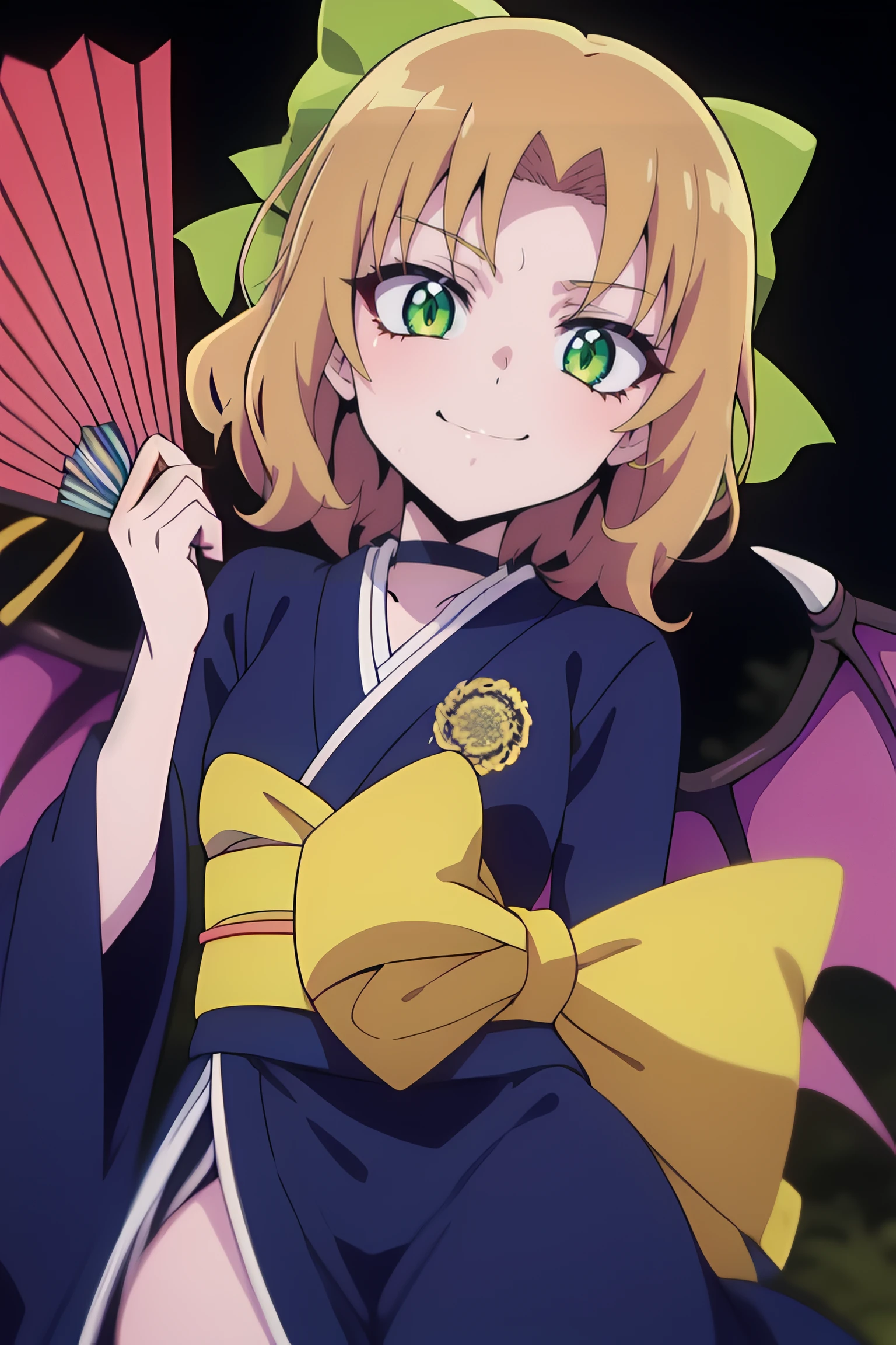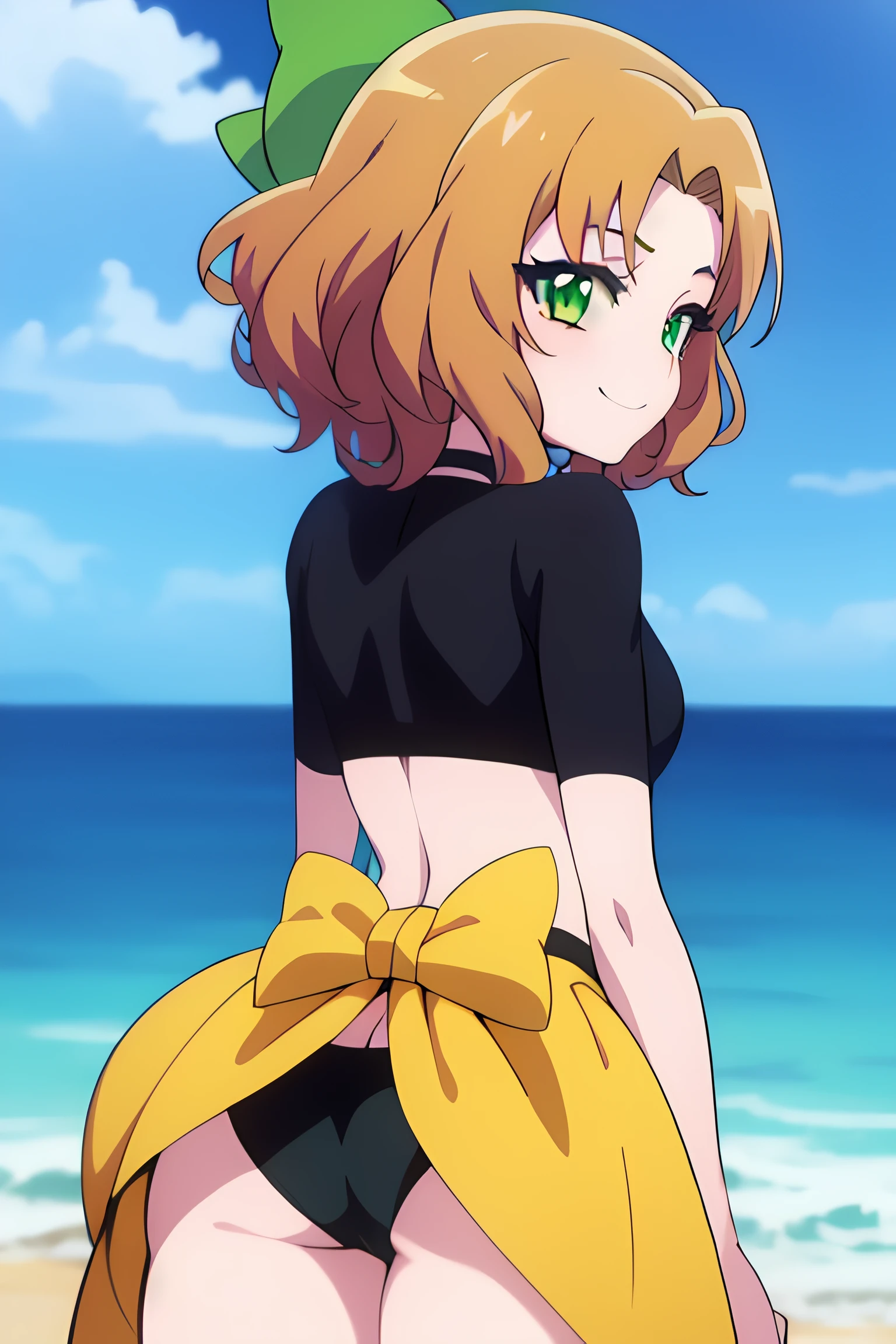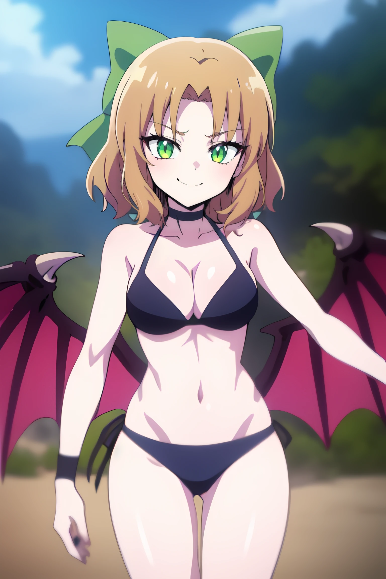 amon sloth, 1girl, short_hair, solo, green_eyes, bow, hair_bow, brown_hair, blonde_hair, smile, green_bow,