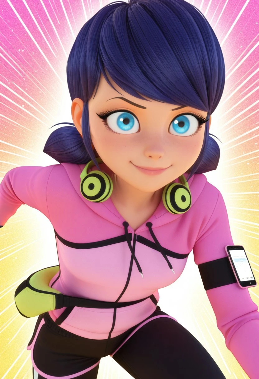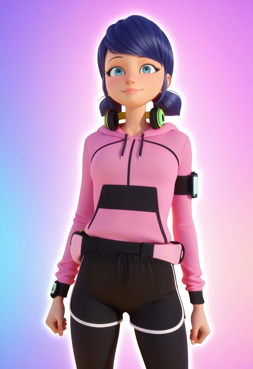 slim headphone on neck, black armband, pink hoodie with black lines, hood down, black shorts with pink lines, black leggings, fanny-pack belt, black-pink sneakers with white soles,