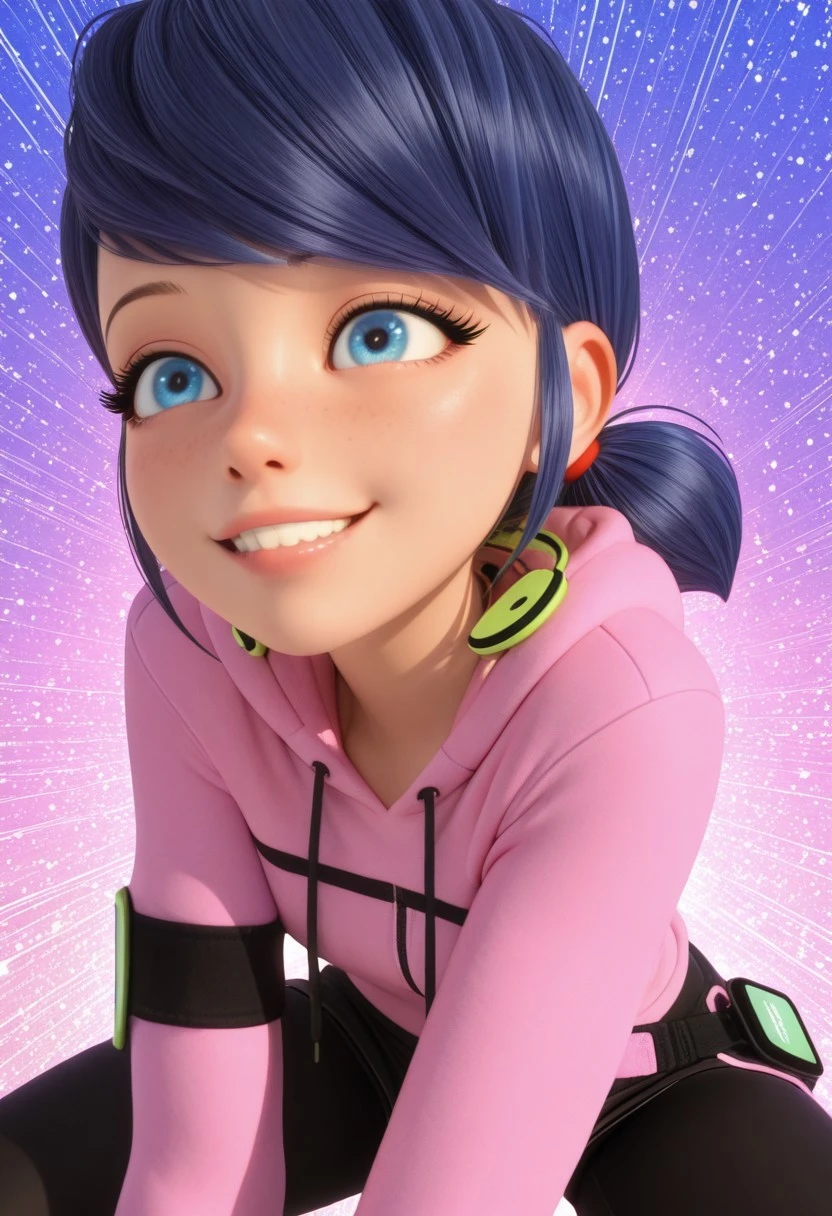 MLjoggingmarinette, blue hair, low twintails, short twintails, swept bangs, blue eyes, light freckles,