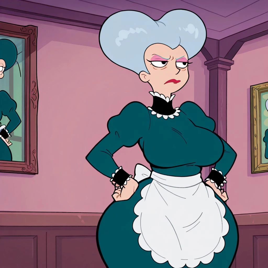 human female, solo, mature, light pink eyeshadow, red lipstick, black eyes, large bouffant hair, gray hair, large breasts, wide hips, dark green dress with black collar, frilled collar and cuffs, white waist apron,