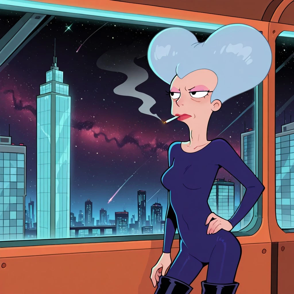 human female, solo, mature, wrinkles, light pink eyeshadow, red lipstick, black eyes, large bouffant hair, gray hair, dark blue , breasts, skinny, boney hips, thigh-high black heeled boots,