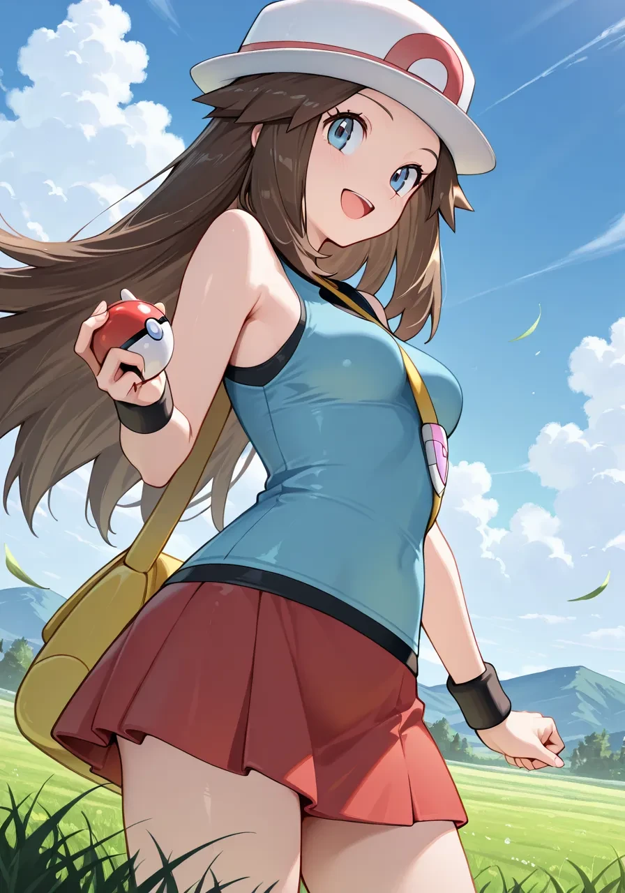 Default Outfit: LeafDEF, white hat, yellow shoulder bag, blue shirt, sleeveless, wristband, red skirt, blue looseless socks, white shoes