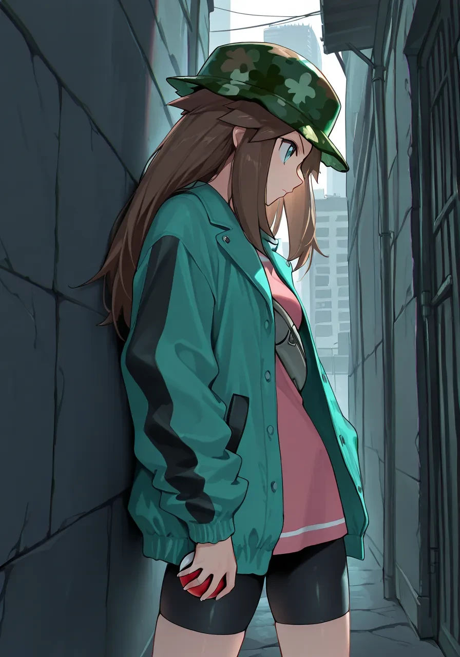 Sygna Suit: LeafSYG, camouflage headwear, open jacket, green jacket, pink shirt, bike shorts, black footwear