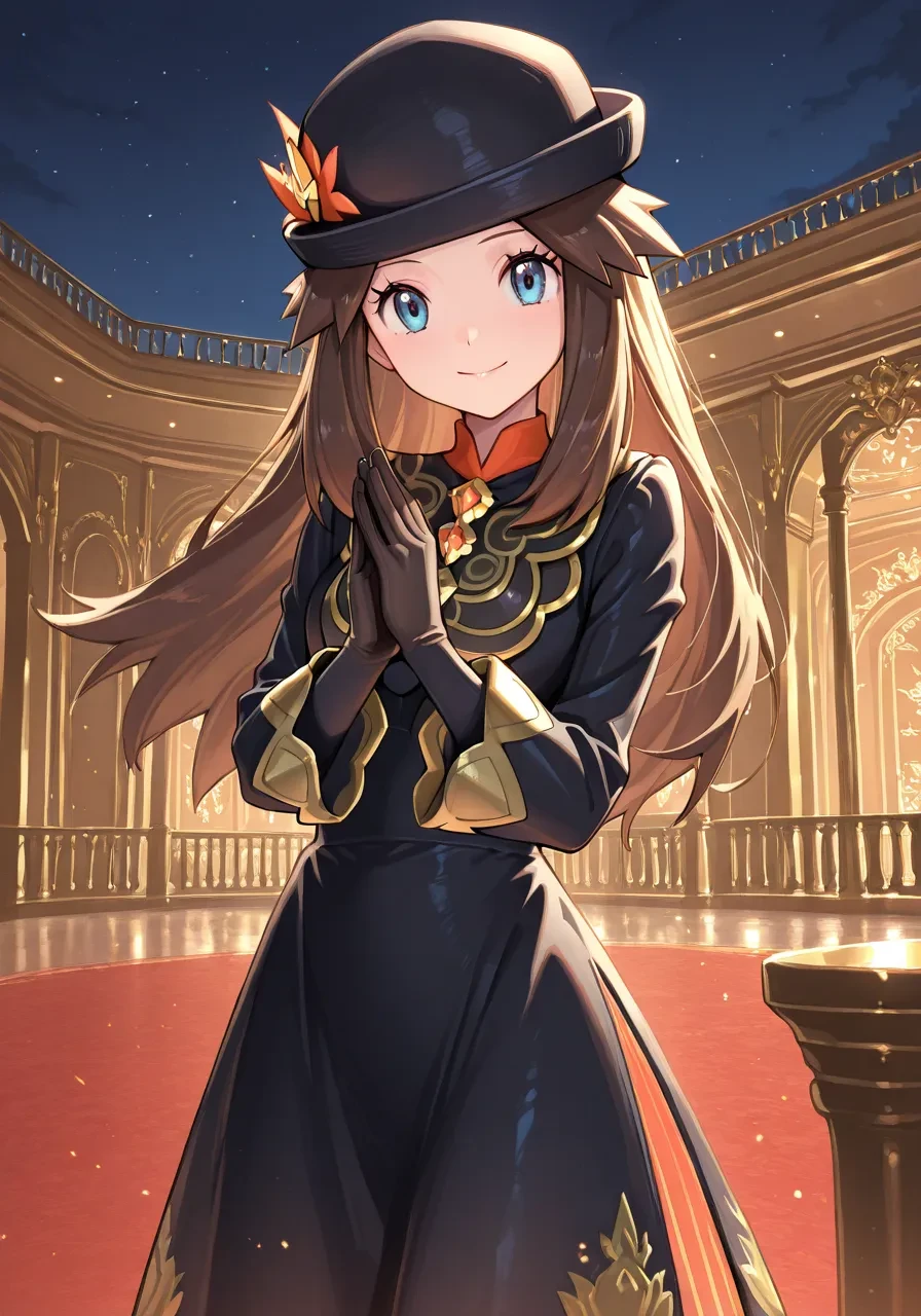 Champion: LeafCHA, black headwear, black dress, gold trim, gem, black gloves, black shoes