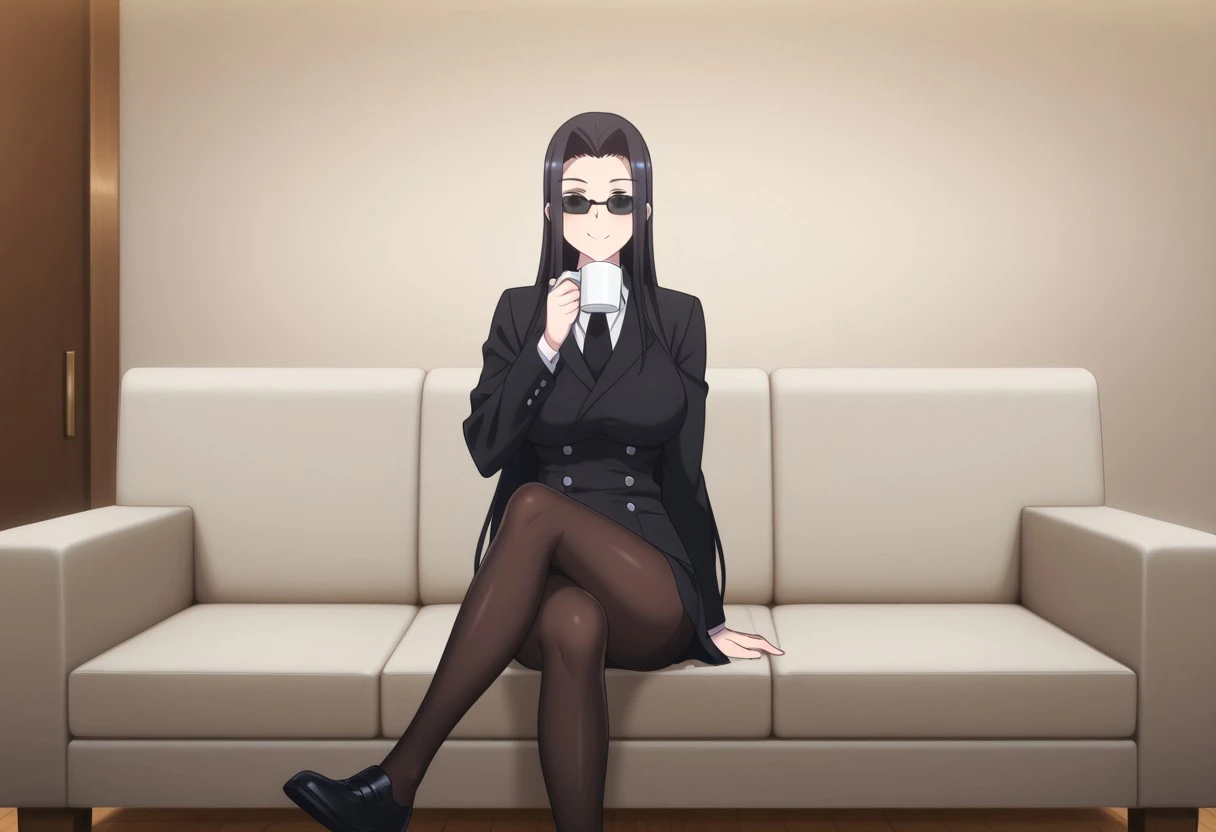 Suit: suit, black suit, black jacket, black skirt, white shirt, black tie, pantyhose, black shoes