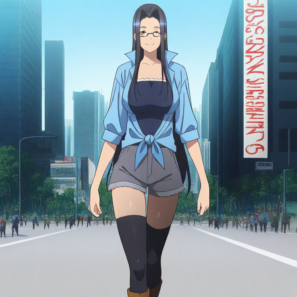 Casual: grey shorts, black tank top, blue shirt, tied shirt, black thighhighs, zettai ryouki, boots, glasses