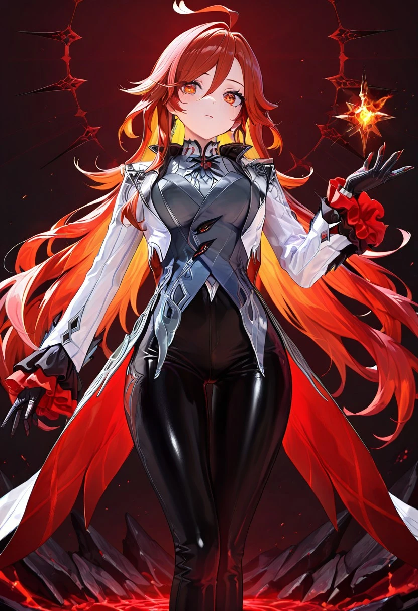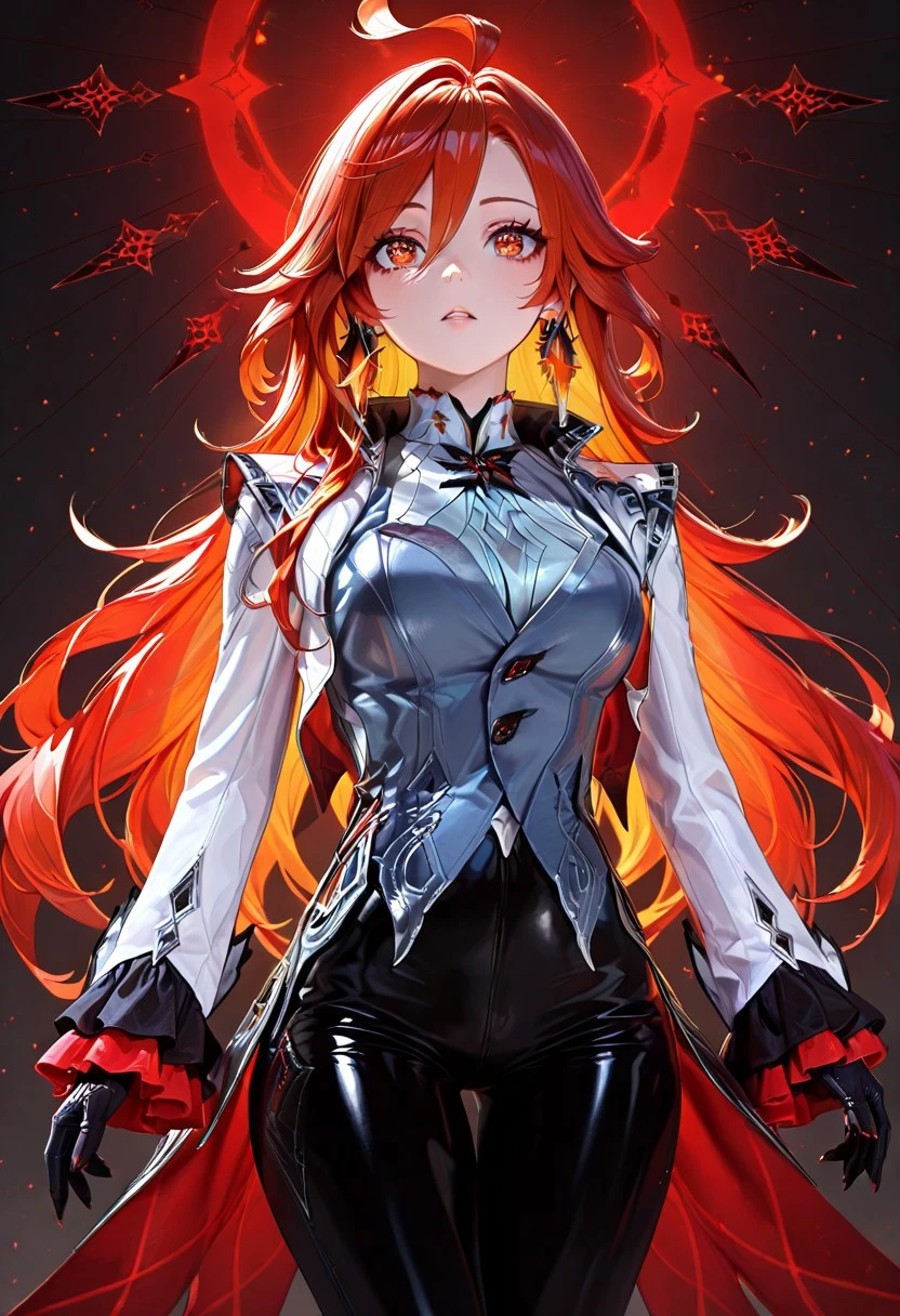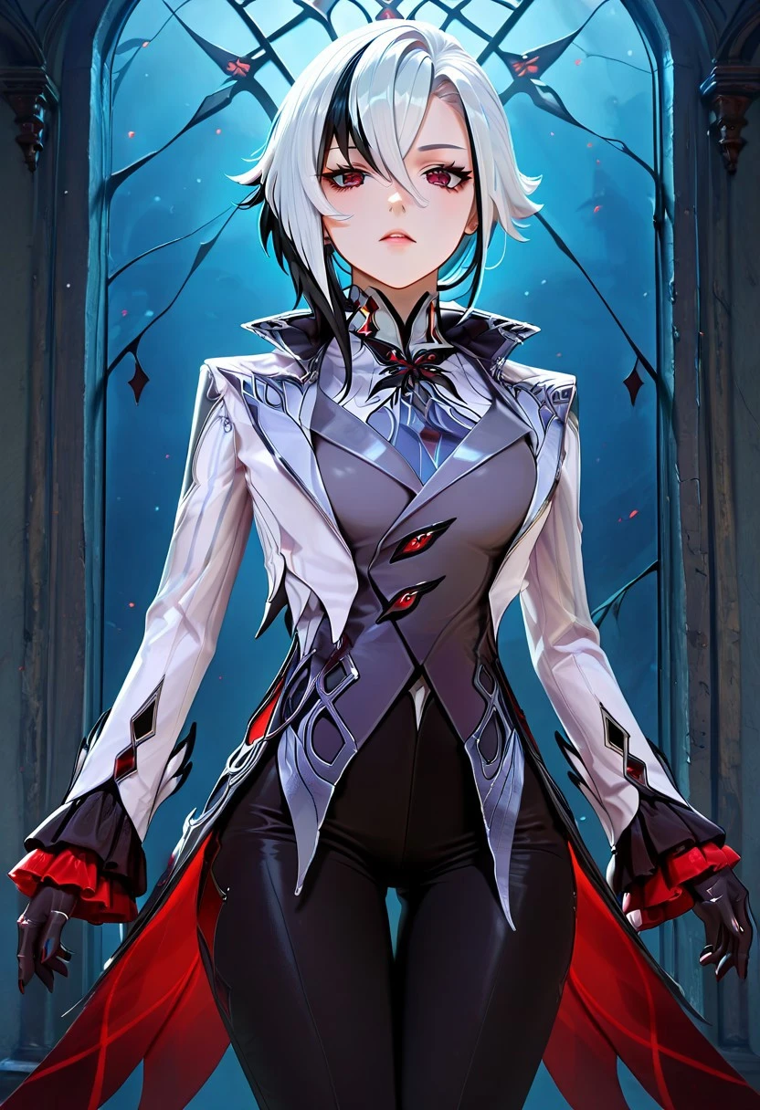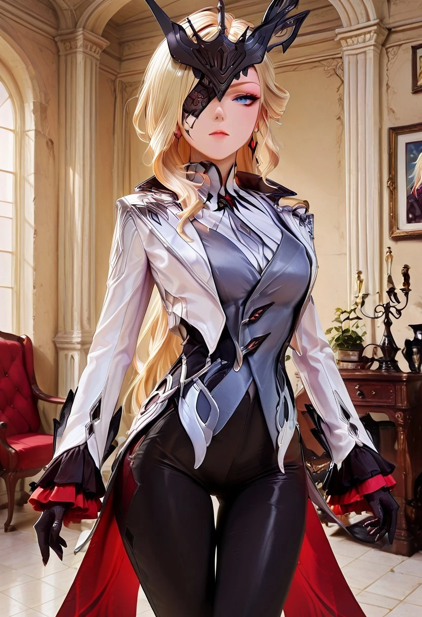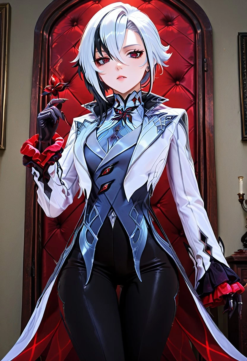 arlcchnoclstyl, long sleeves, gloves, jewelry, jacket, black gloves, pants, vest, black pants, white jacket, fitted jacket, thigh gap, grey vest, coattails, pant suit, shirt, , grey shirt, frilled sleeves, tight pants, suit, heels