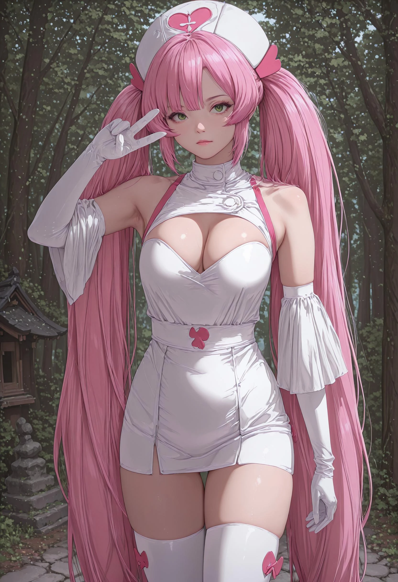 Trigger : 1girl, solo, pink hair, green eyes, bangs, very long hair, twintails, white elbow gloves, thighhighs, nurse cap, short white dress, white boots, clothing cutout, bare shoulders, cleavage cutout,