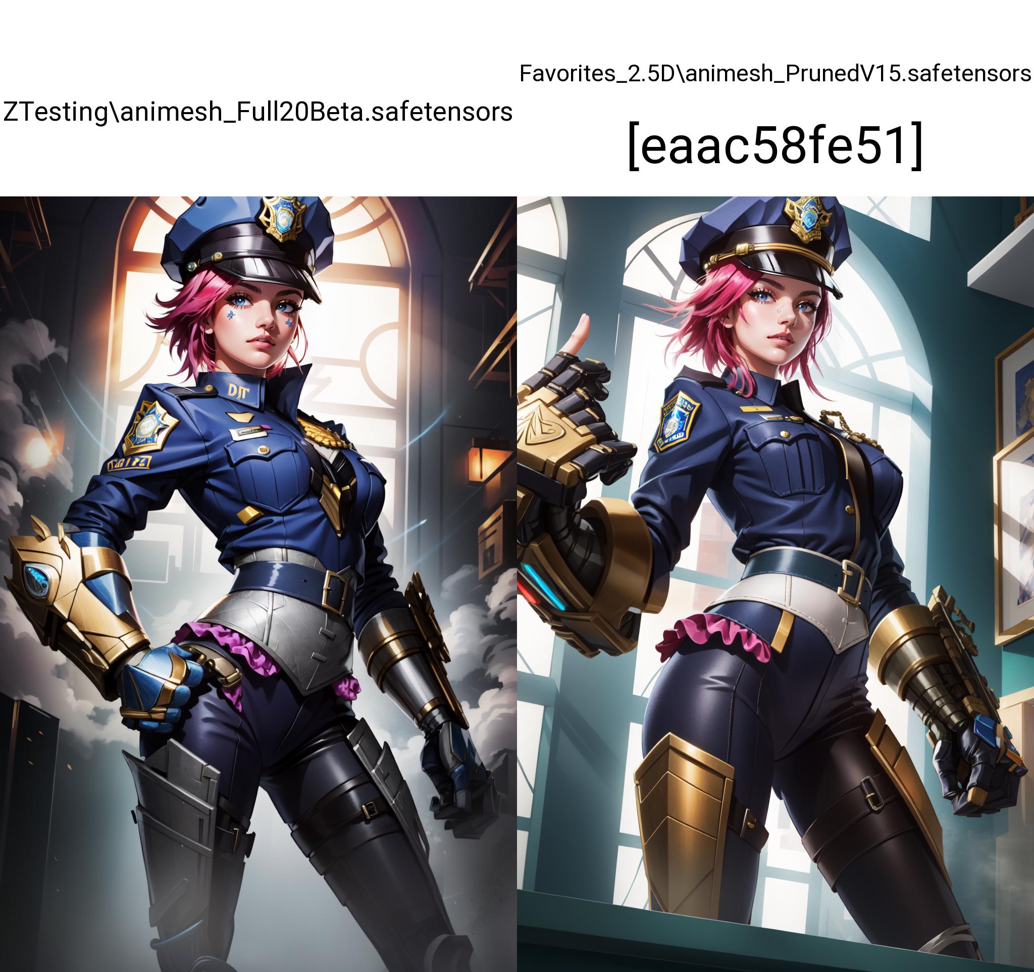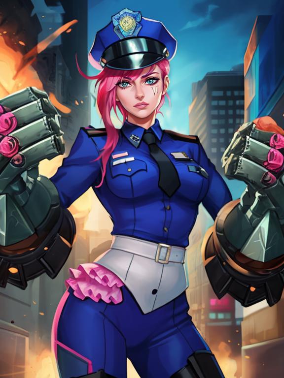 For police uniform: <lora:Viv220:0.8>(vi, police uniform, policewoman, gauntlets, pink hair, hat)