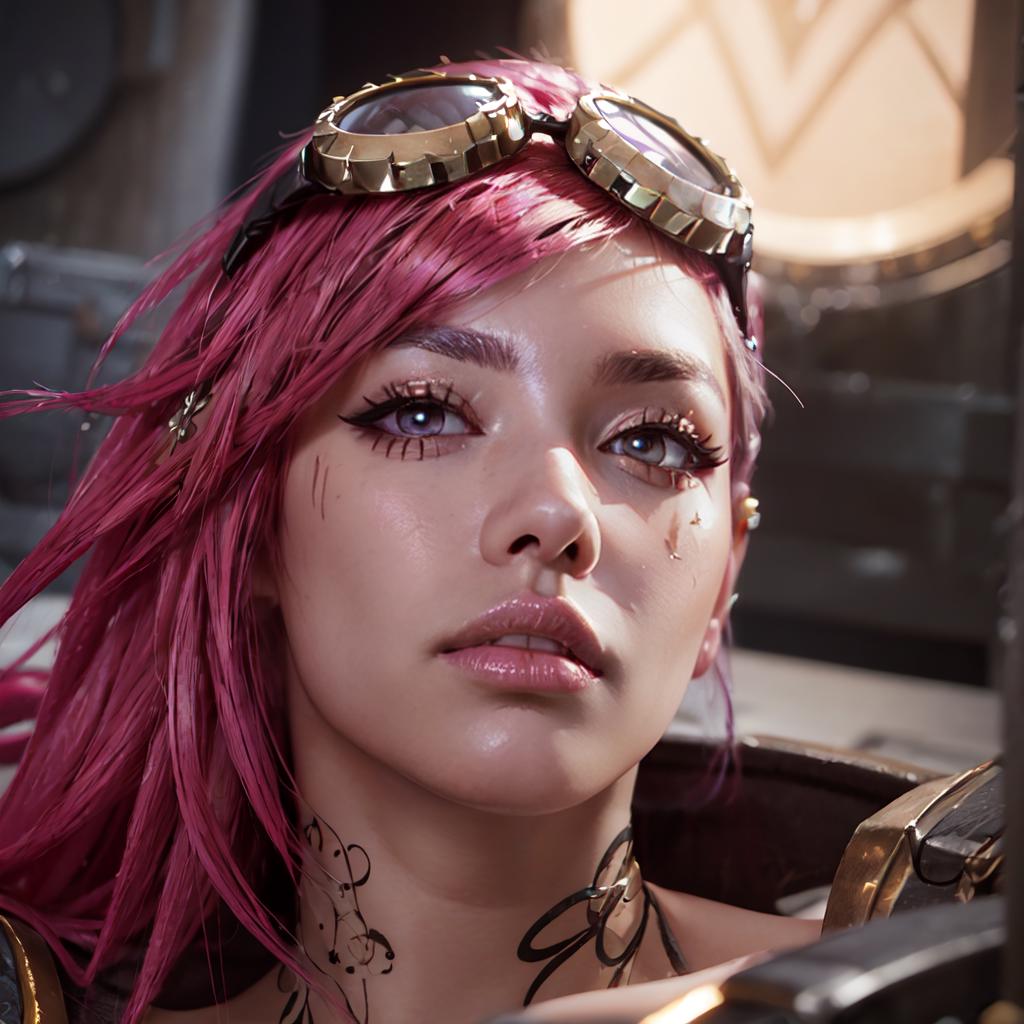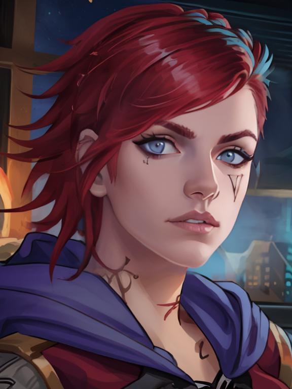 For arcane version: <lora:Viv220:0.8>(vi, arcane, bandaged arm, red hair, hood, muscular female, jacket)