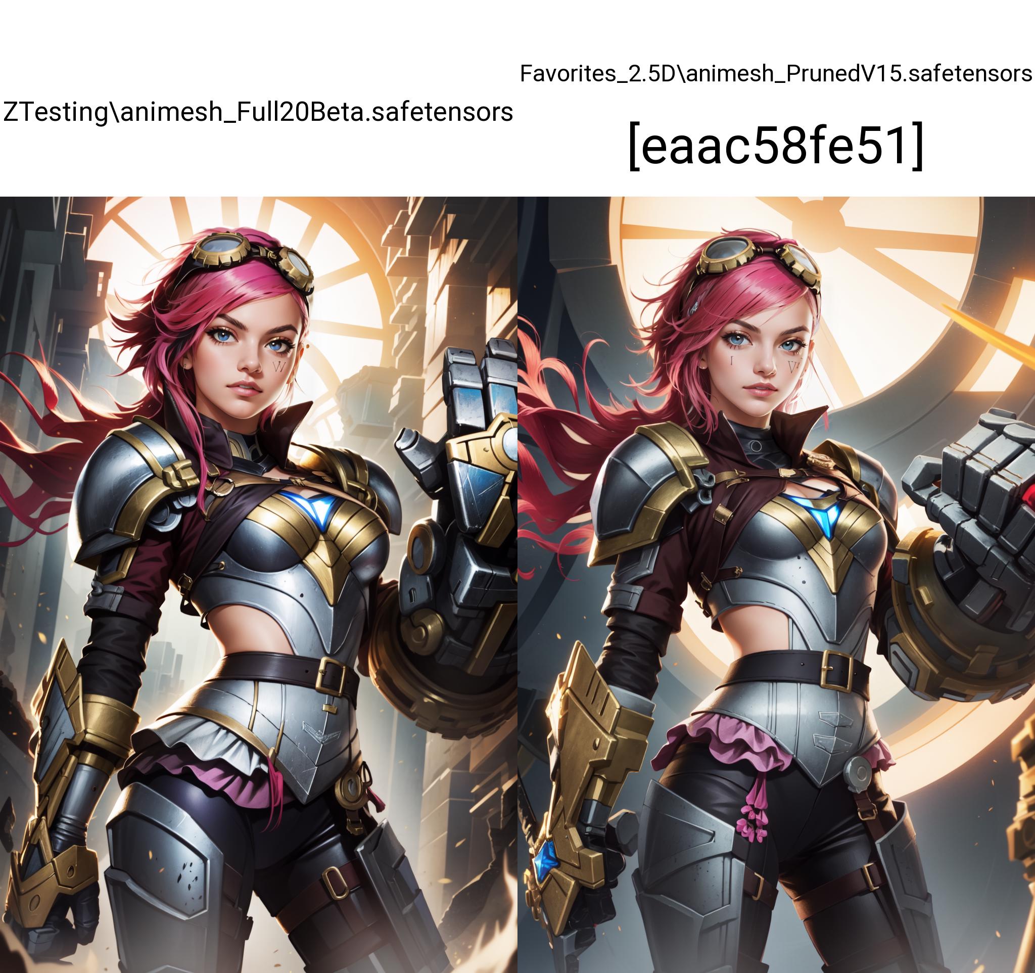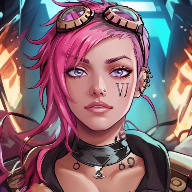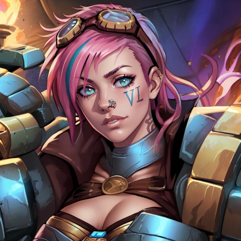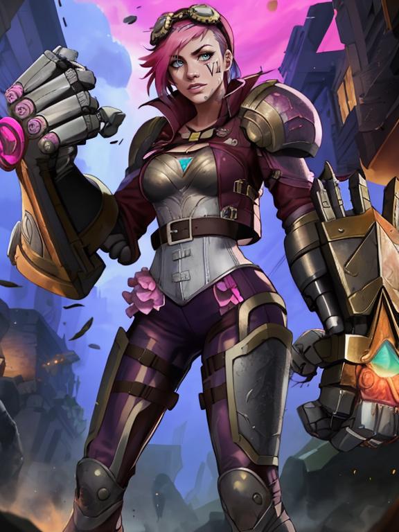 For original clothes: <lora:Viv220:0.8>(vi, original-clothes, gauntlets, pink hair, goggles on head)