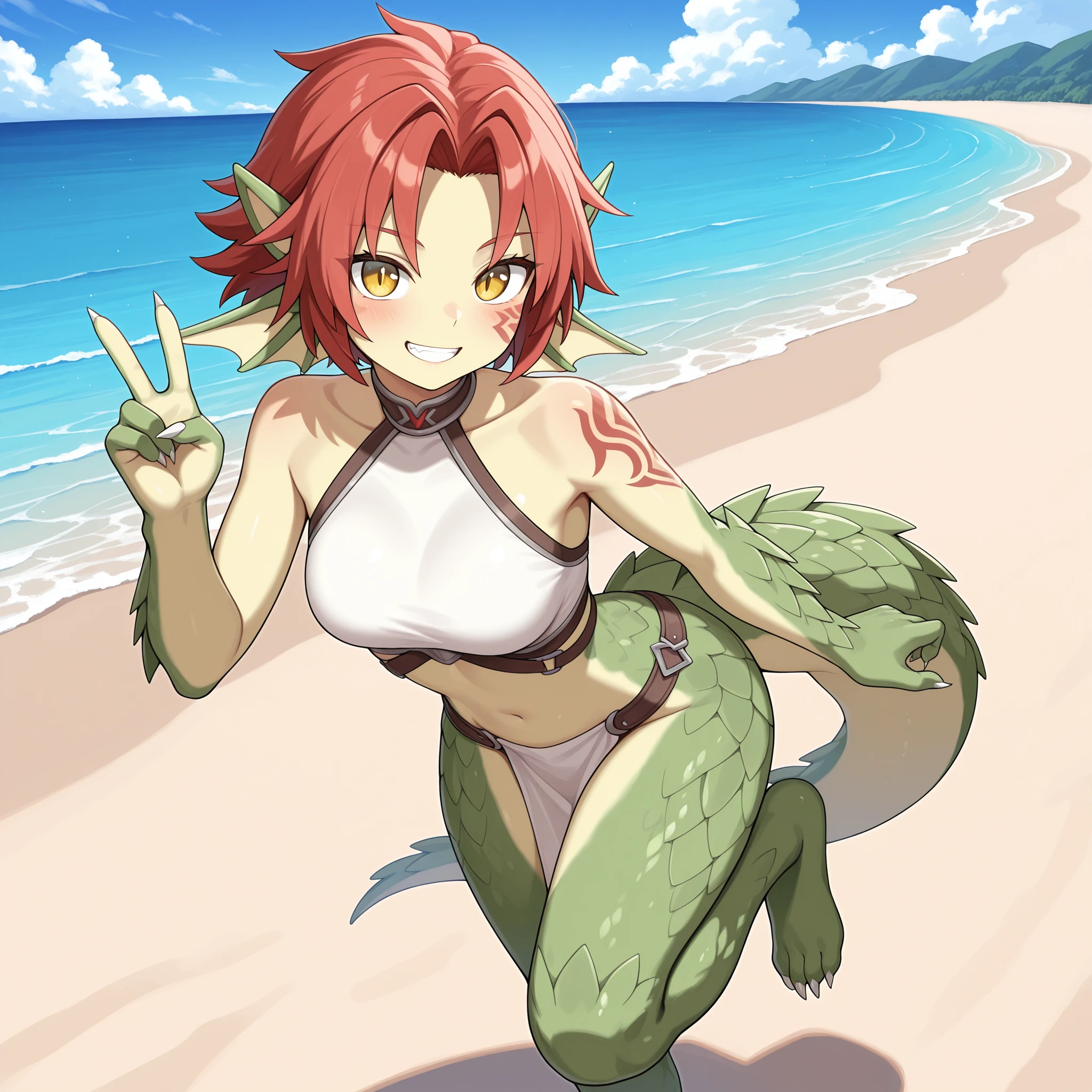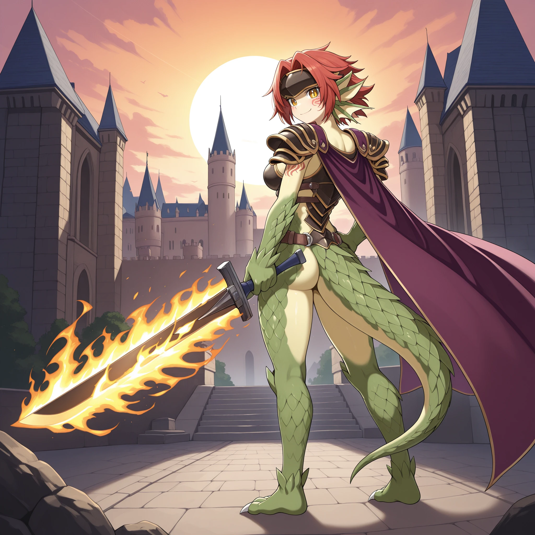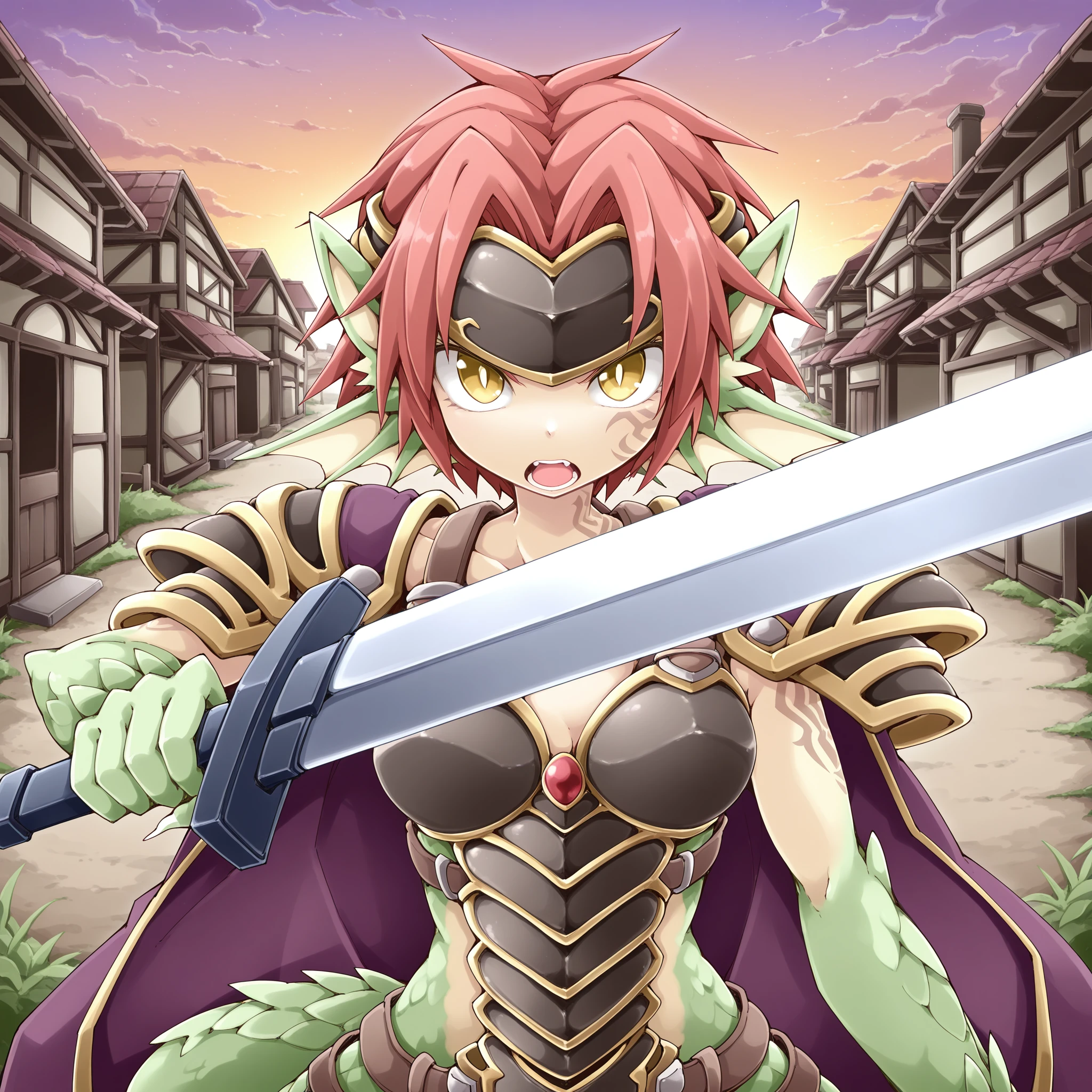 berrymgq, granberia, monster girl, dragon girl, green scales, yellow skin, red hair, short hair, dragon ears, head fins, yellow eyes, slit pupils, bright pupils, facial tattoo, shoulder tattoo, claws, dragon tail, forehead protector, purple & gold cape, shoulder armor, boobplate
