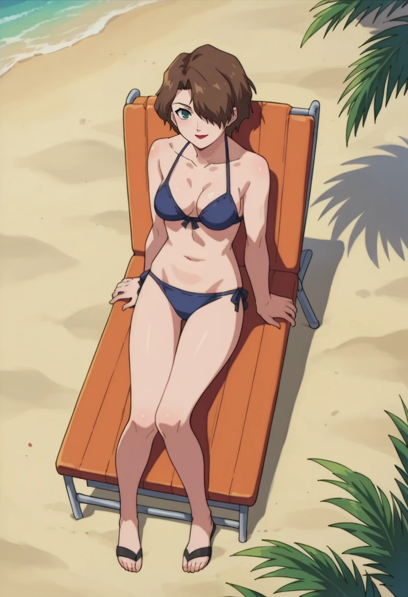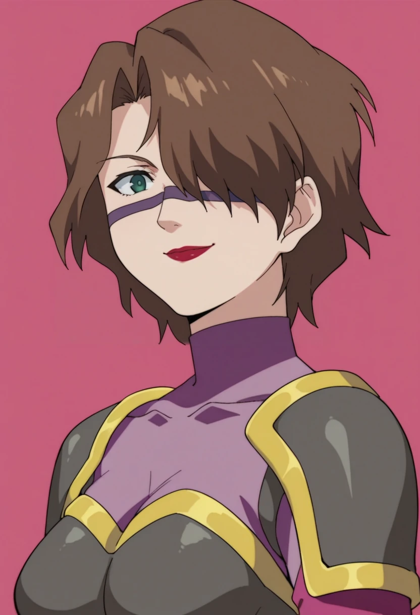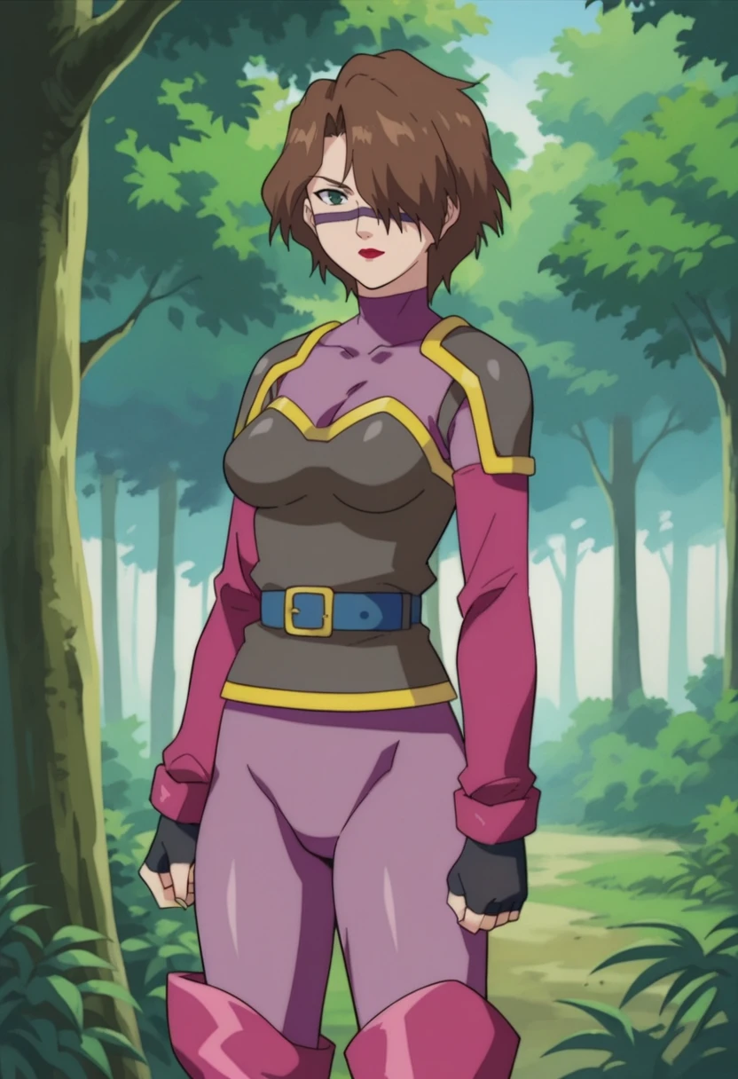 zviora,1girl,solo,green eyes,brown hair,short hair,hair over one eye,facial mark,lipstick,purple bodysuit,pink sleeves,armor,shoulder pads,blue belt,fingerless gloves,thigh boots
