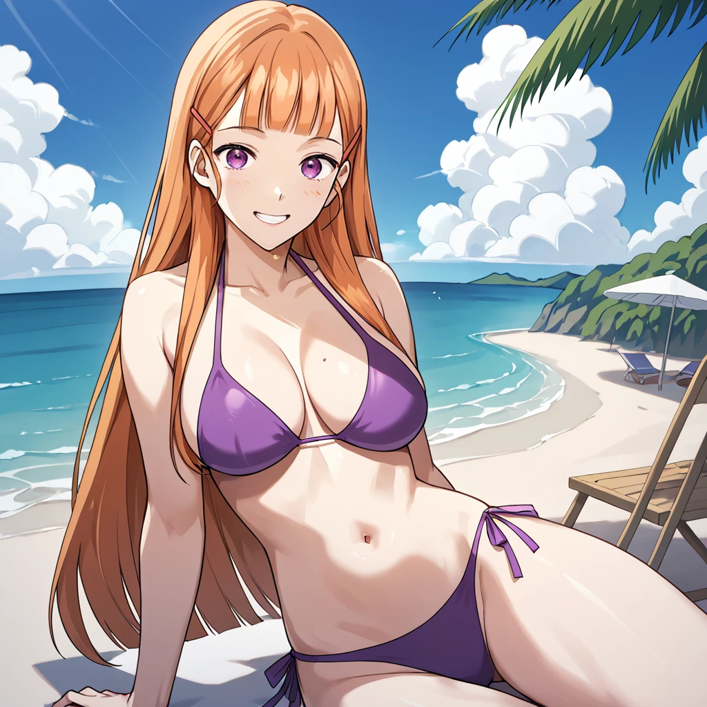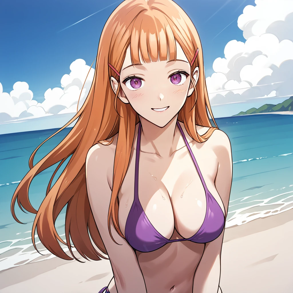 sharelle, long hair, blunt bangs, bangs, orange hair, purple eyes,
