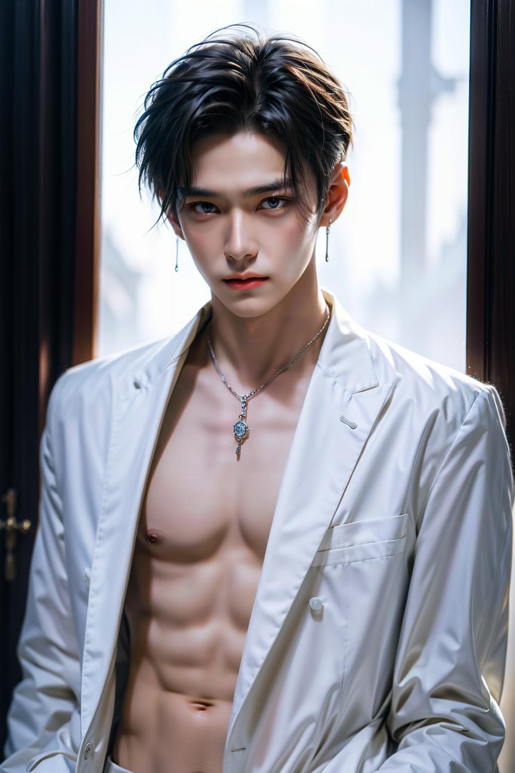 focus类触发词:tongue out, letterboxed, portrait, blood on face, blood, jewelry, open mouth, teeth, extra ears, chain, virtual youtuber, black choker,cat ears, , bishounen, eyes visible through hair,tattoo, black shirt, formal, fur trim, forehead mark, piercing, head tilt, blurry, light particles,turtleneck, air ornament,scar on face, wet hair, looking back