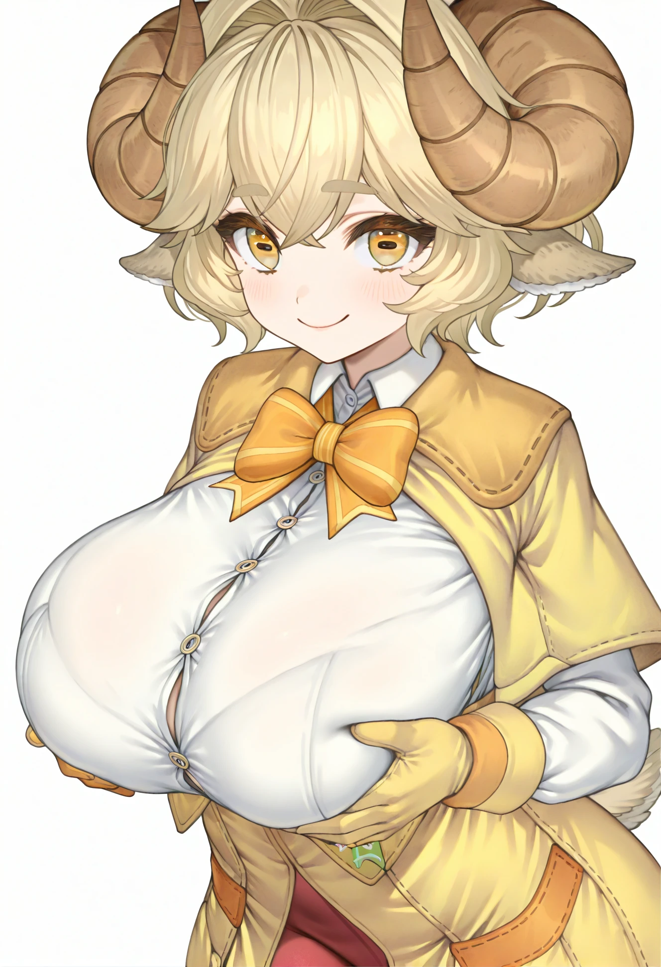 eira woolcott, sheep girl, sheep ears, blonde hair, short hair, hair vents, ahoge, yellow eyes, horizontal pupils, sheep horns, thick eyebrows, large breasts, hooves,