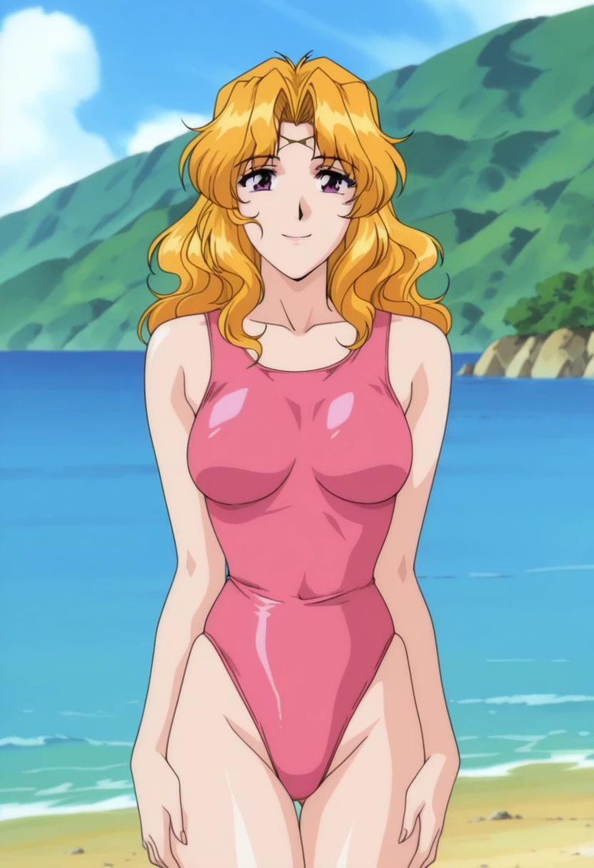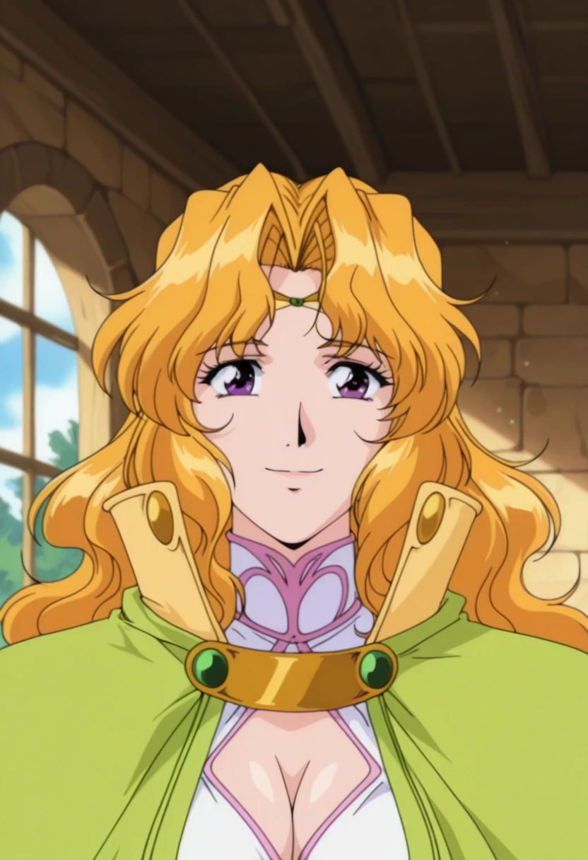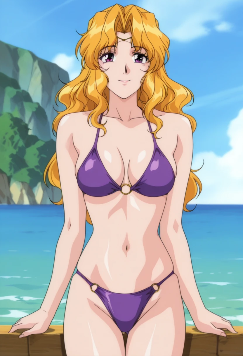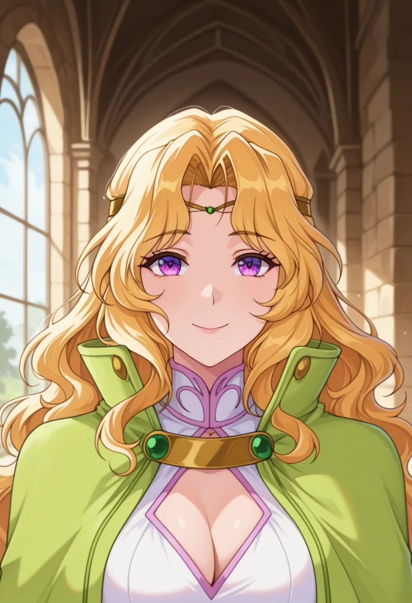 melissaww, mature female, purple eyes, blonde hair, long hair, wavy hair, parted bangs, circlet, medium breasts,