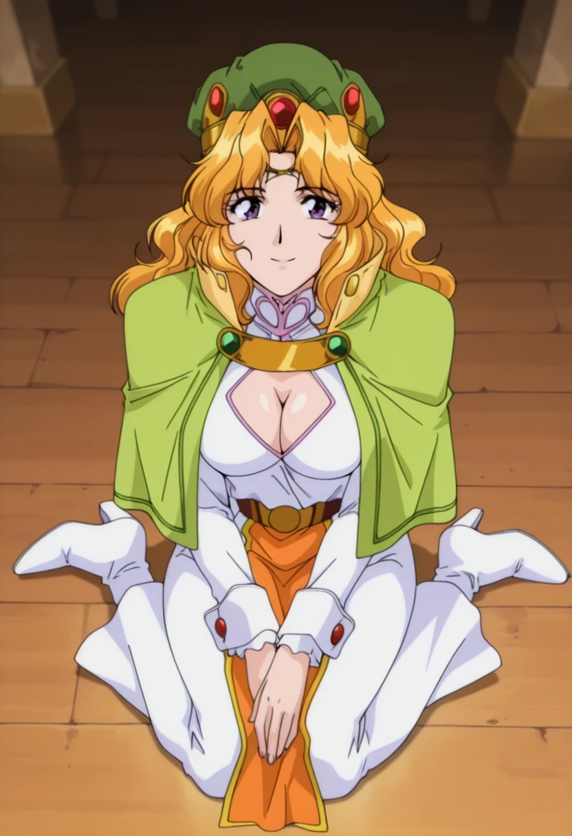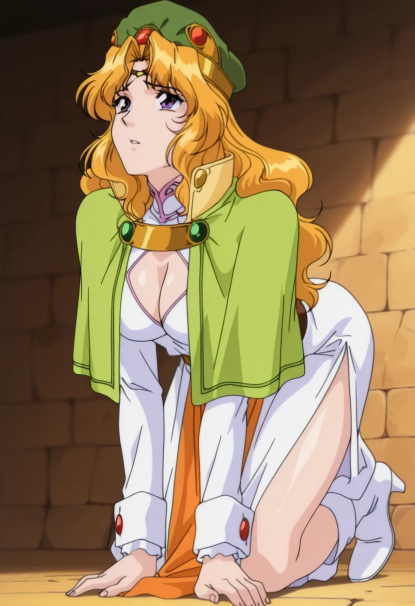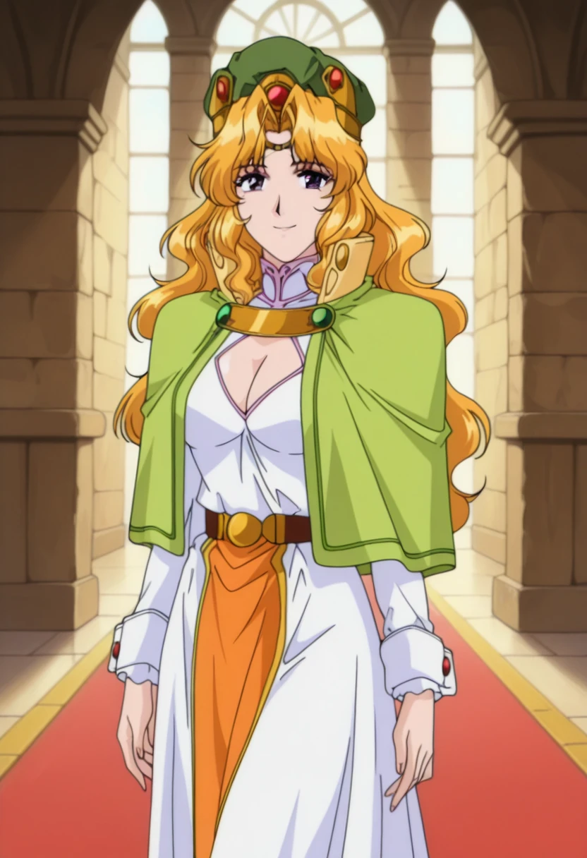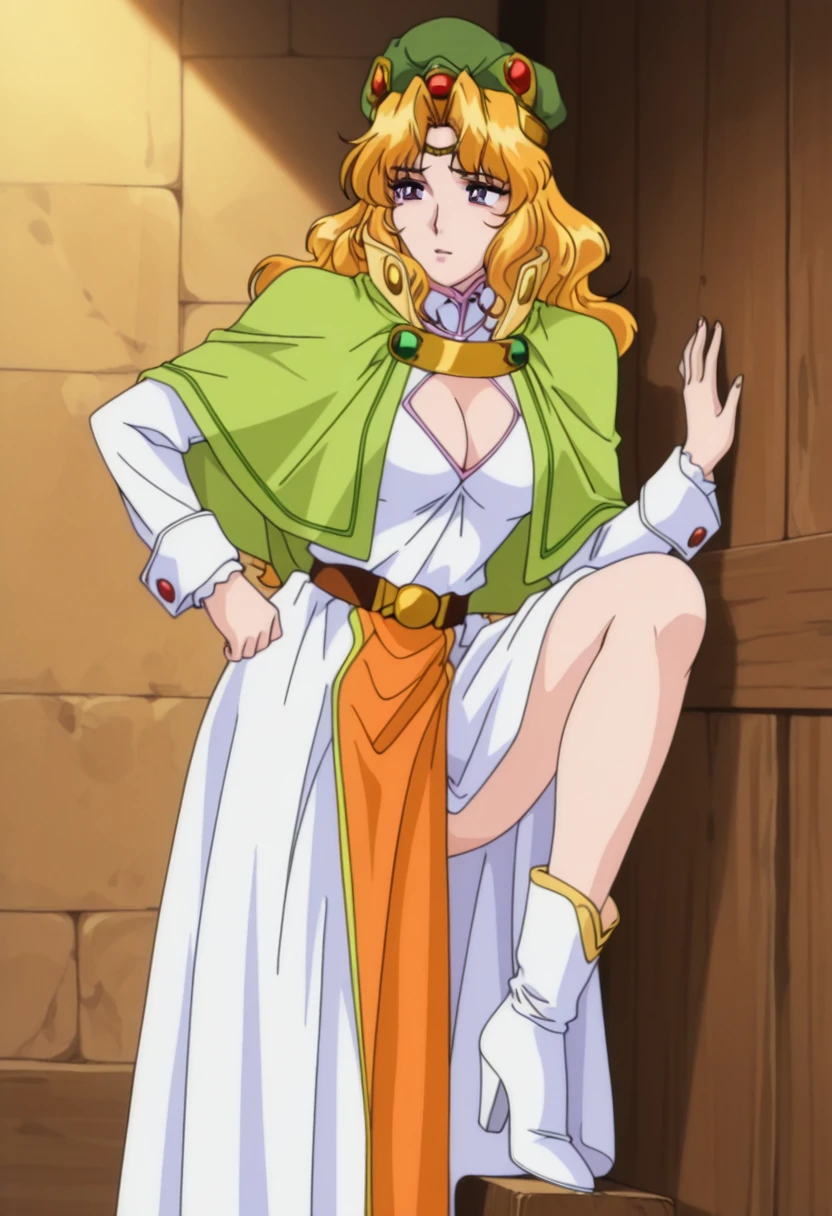 green hat, light green capelet, breasts, cleavage, cleavage cutout, white long dress, long sleeves, brown belt, orange loincloth, white boots, high heels,