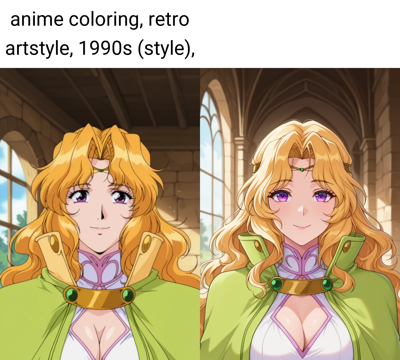 プロンプトに"anime coloring, retro artstyle, 1990s (style)"を入れないと、再現度が大きく低下してしまいます。