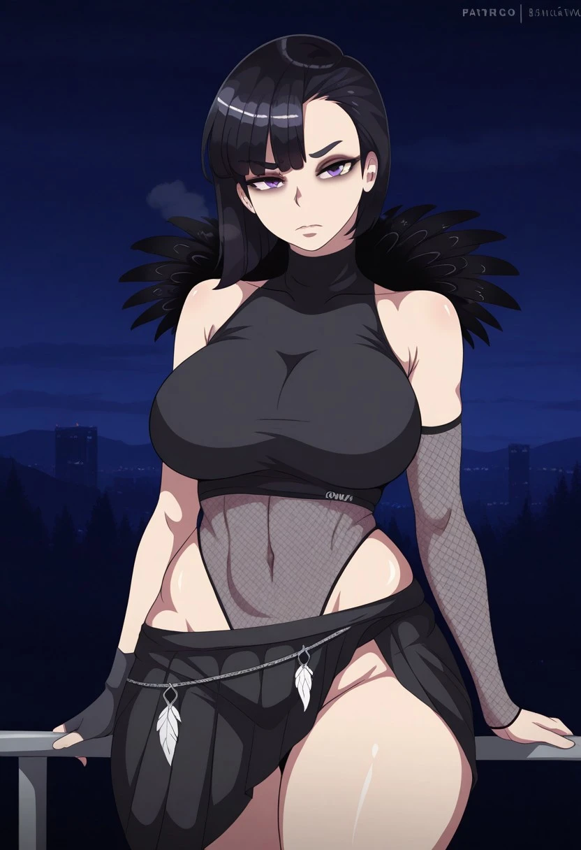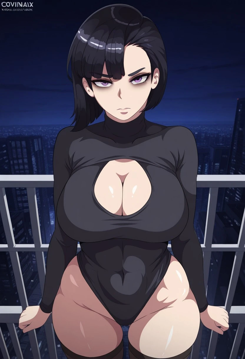 CorvinaXL, black hair, bangs, short hair, purple eyes, large breasts
