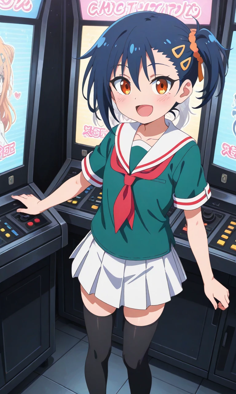 aoi kusakabe,dark blue hair,orange eyes,mole under eye,short ponytail,decorative gold clips,teal school uniform, green serafuku, sailor collar, red neckerchief, short sleeves, white skirt, pleated skirt, black thighhighs