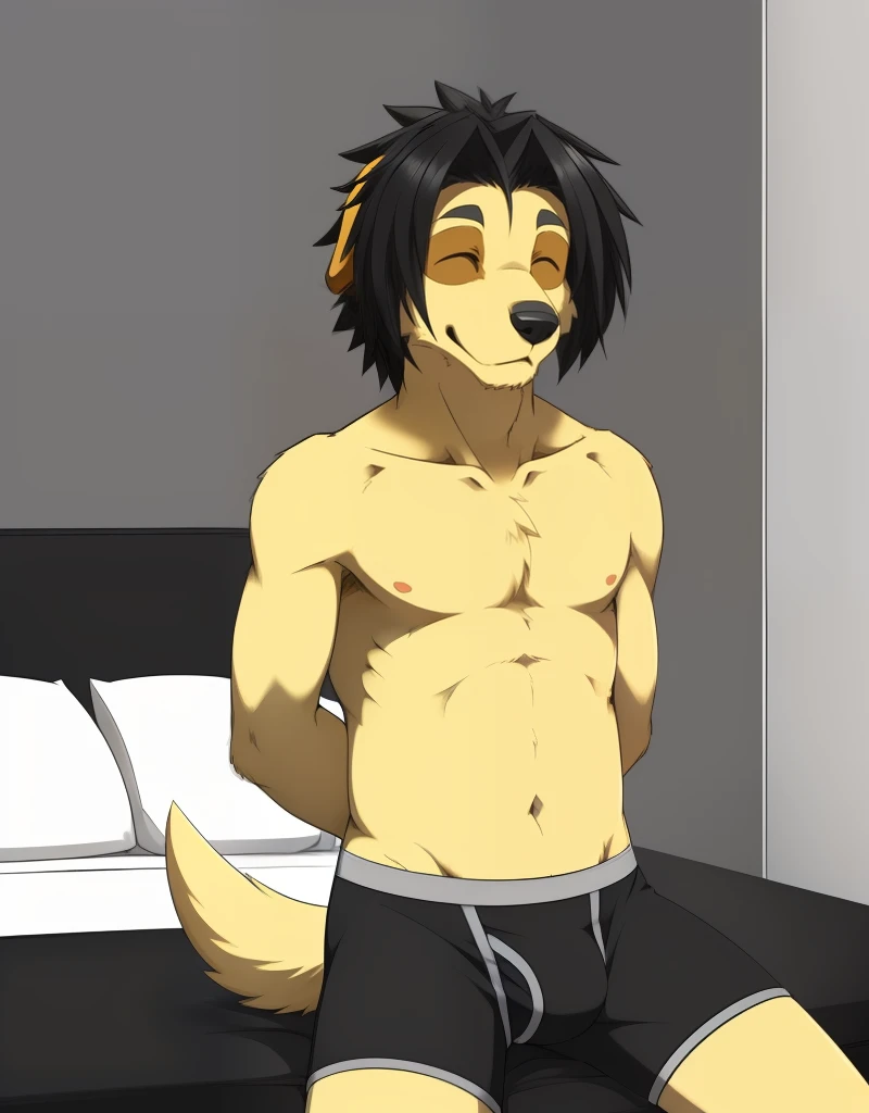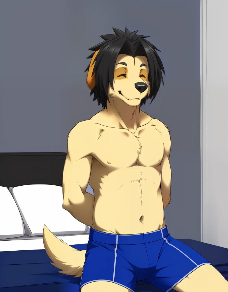 Related words : yellow skin, colored skin, body fur, short hair, black hair, hair intakes, closed eyes, dog tail, dog boy, dog ears, animal ears, animal nose, snout, school uniform, shoes, sneakers, black male underwear, swim_trunks, blue_shorts