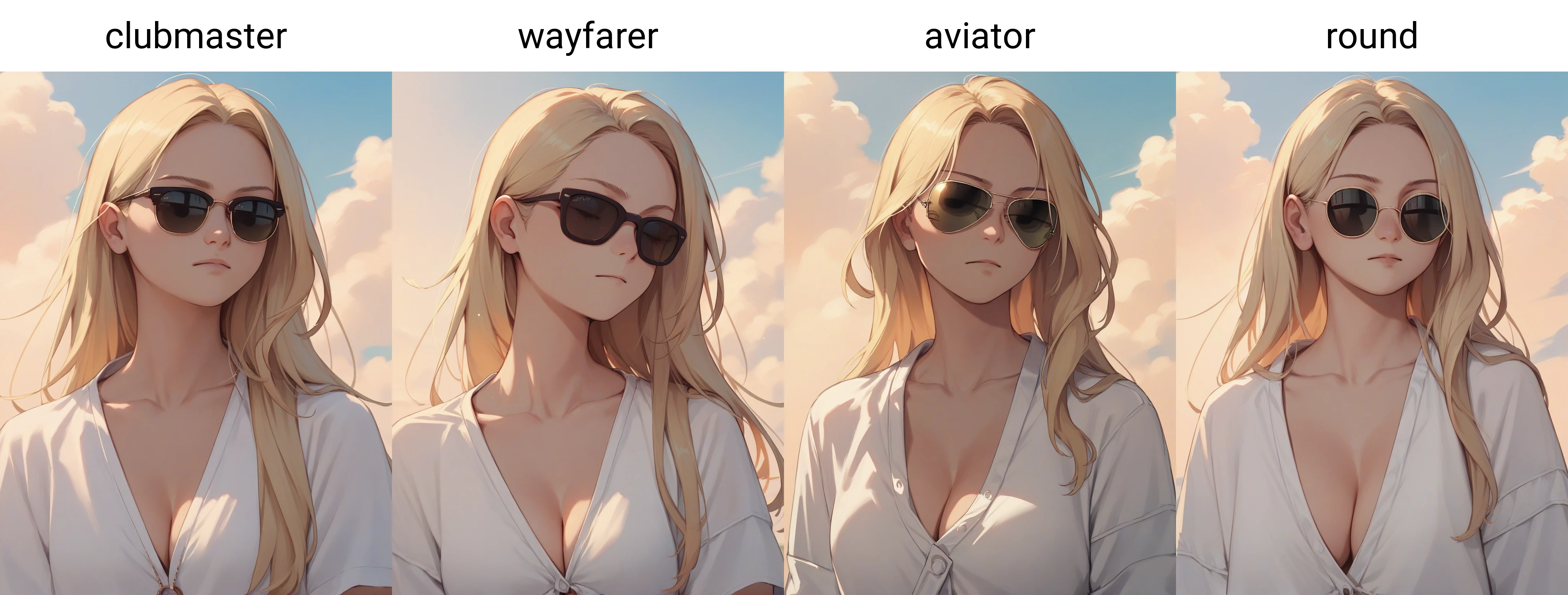 LoRA trained to generate glasses similar to some Ray Ban classics: wayfarer, clubmaster, aviator, and round.