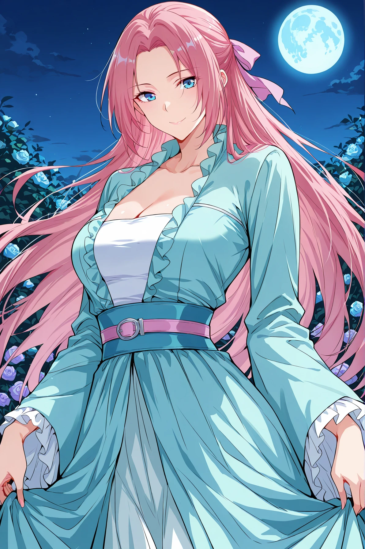 Yunluo_outfit, light blue robe, open robe, ruffled trim, long sleeves, wide sleeves, ruffled cuff, light blue dress, strapless dress, cleavage, blue waist belt, pink waist belt, light blue skirt, long skirt,