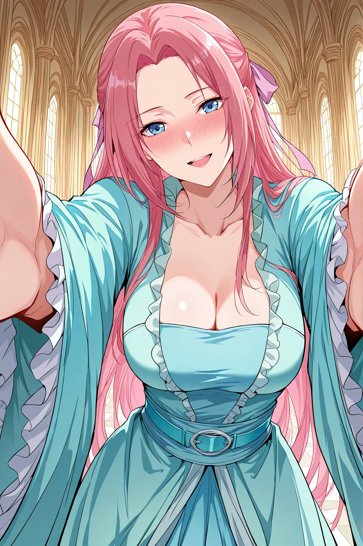 Yunluo, 1girl, solo, blue eyes, light rose hair, long hair, parted bangs, long sidelocks, half updo, pink hair ribbon,