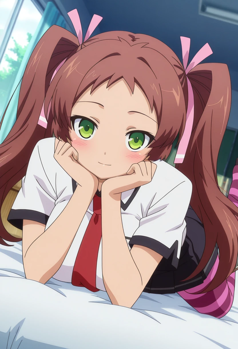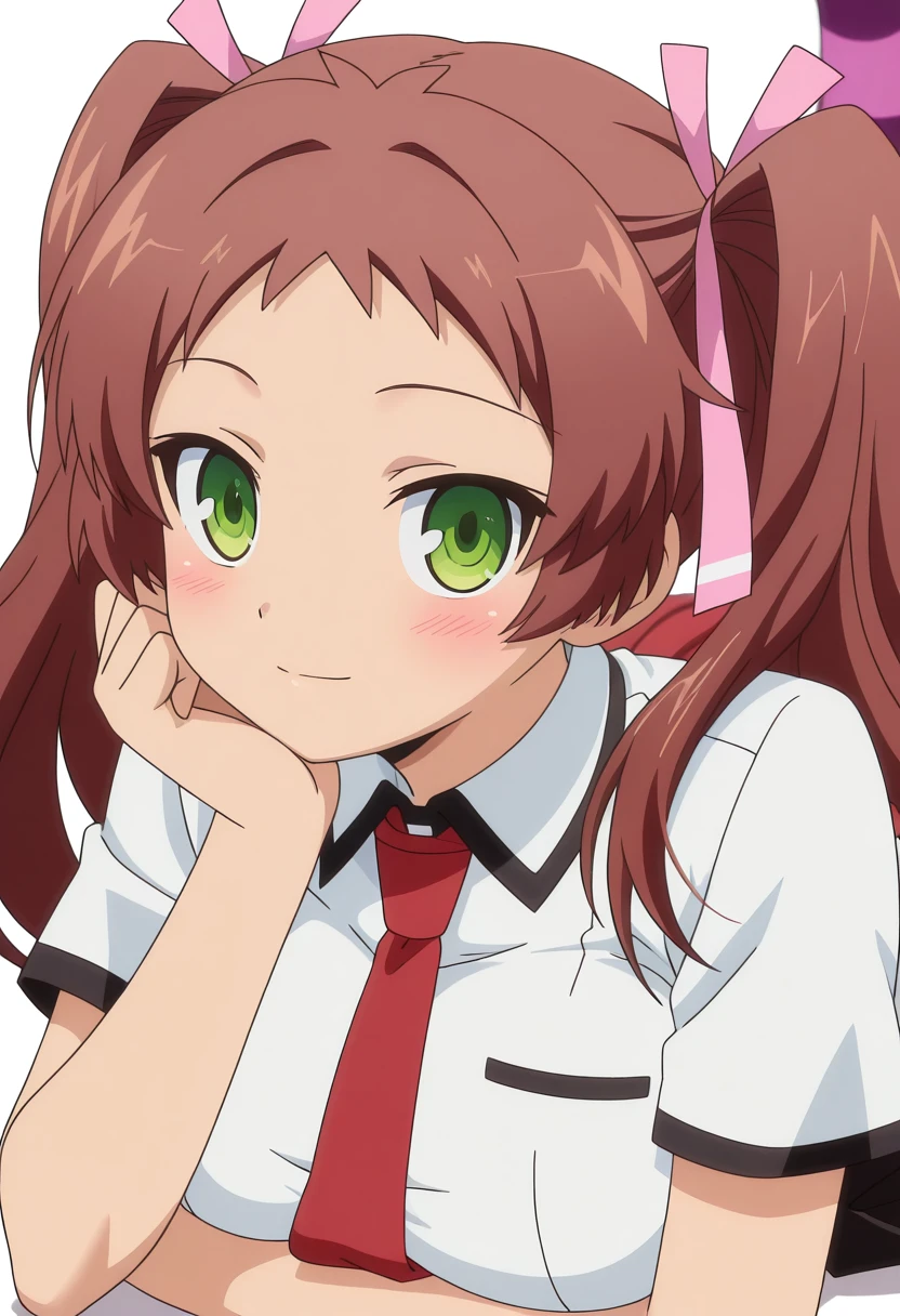 • hazukiww, green eyes, brown hair, long hair, short bangs, twintails,